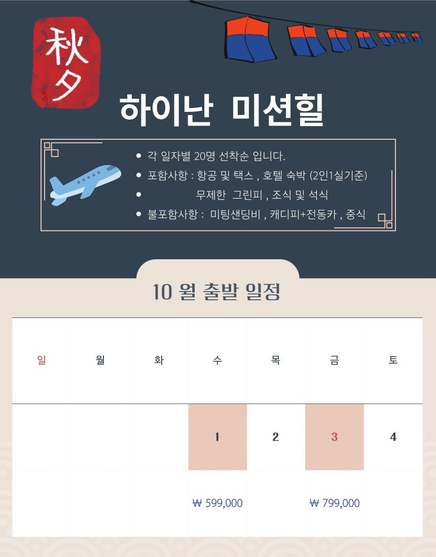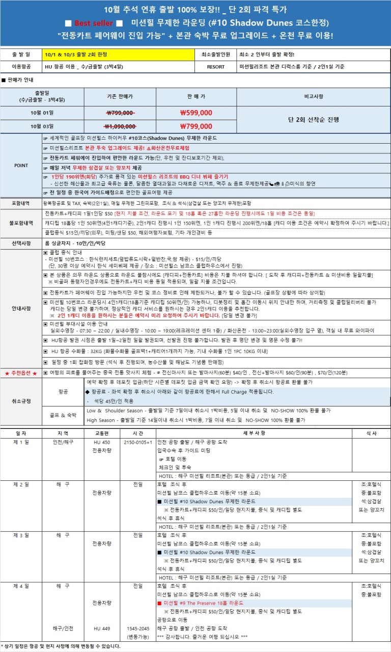 – 10/1 출발 3박4일: 599,000원