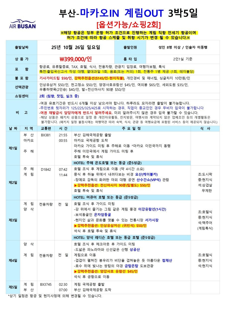 부산출발해외여행💥BX 마카오계림✈ 3박5일 단 하루 특가 – 399,000원 본문