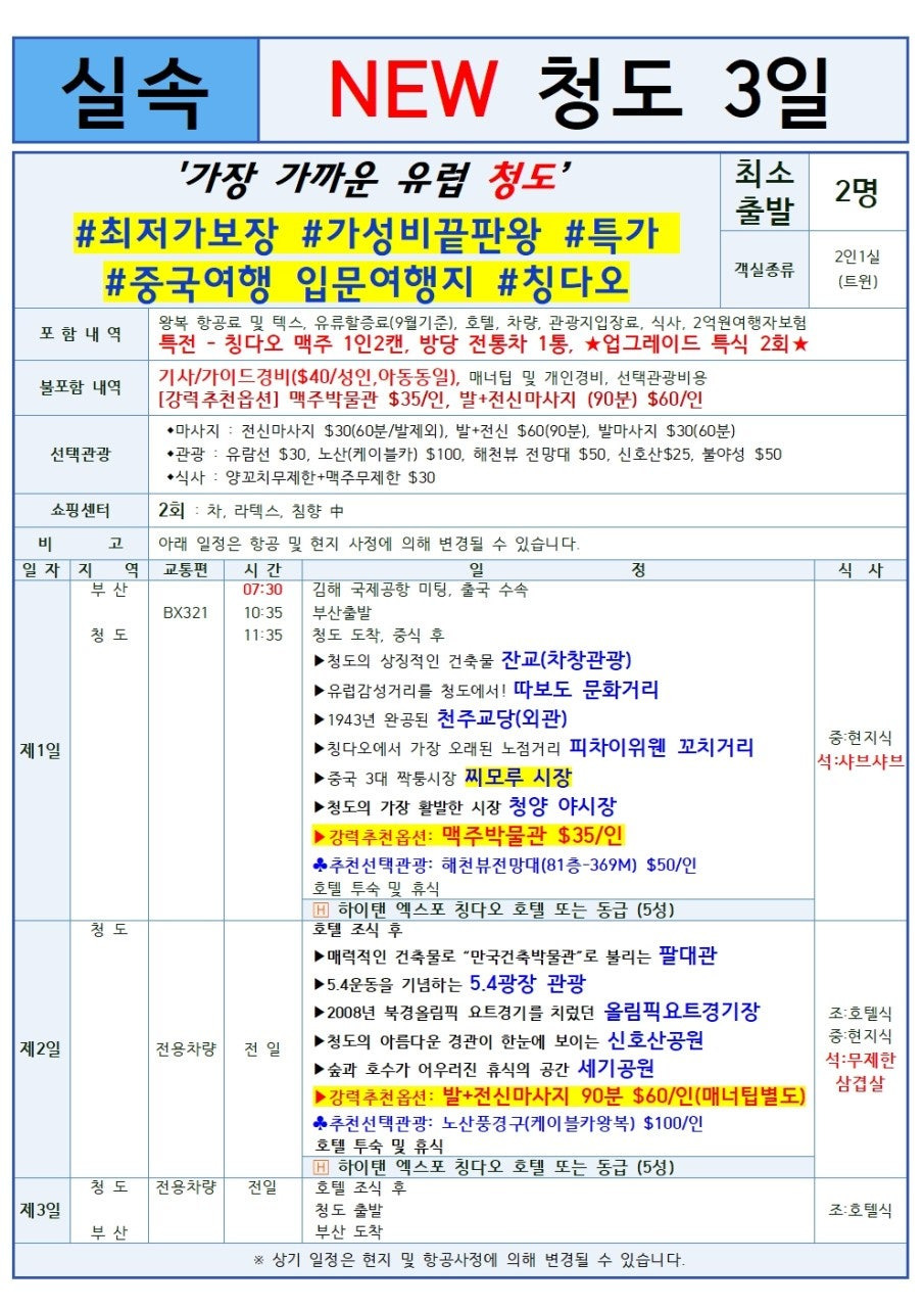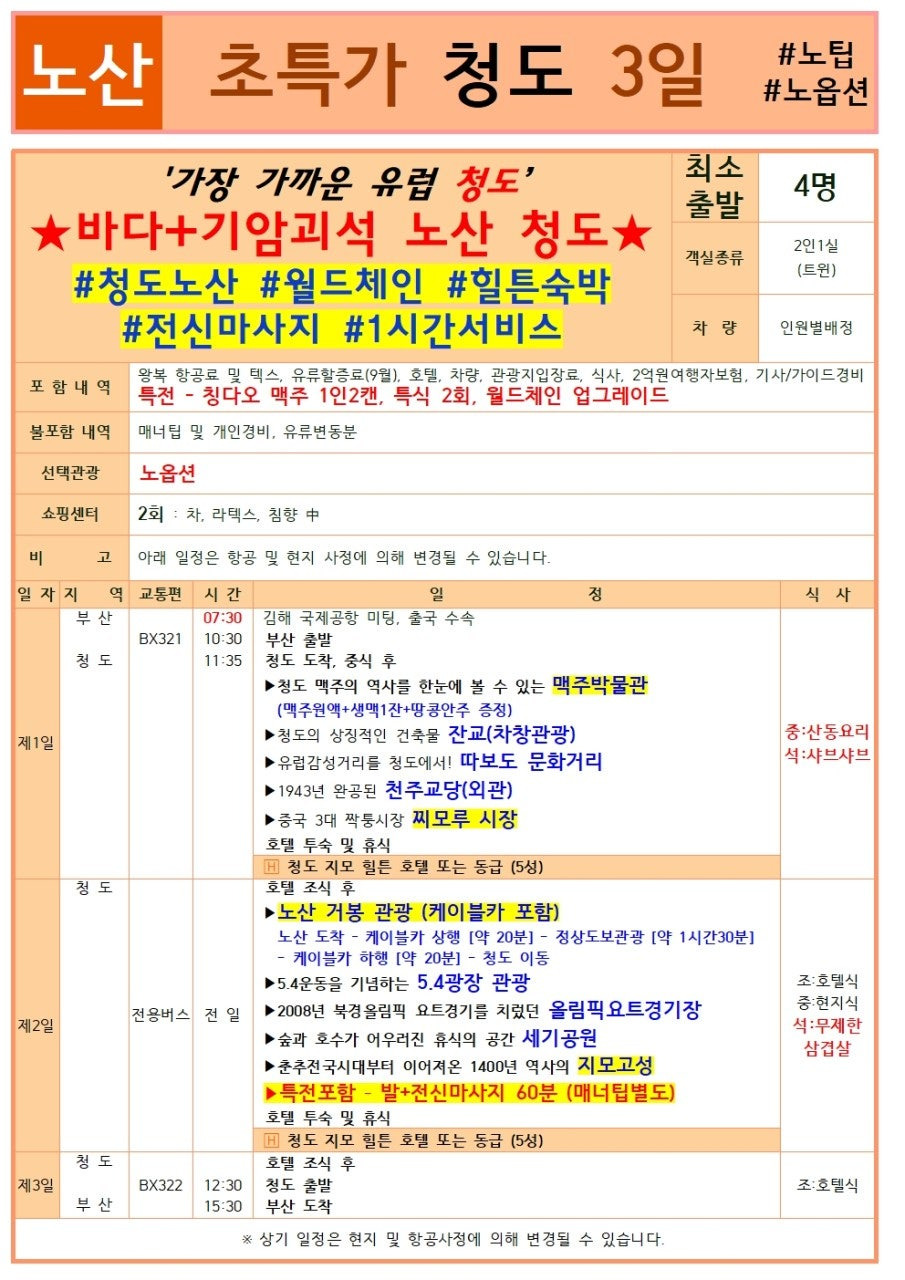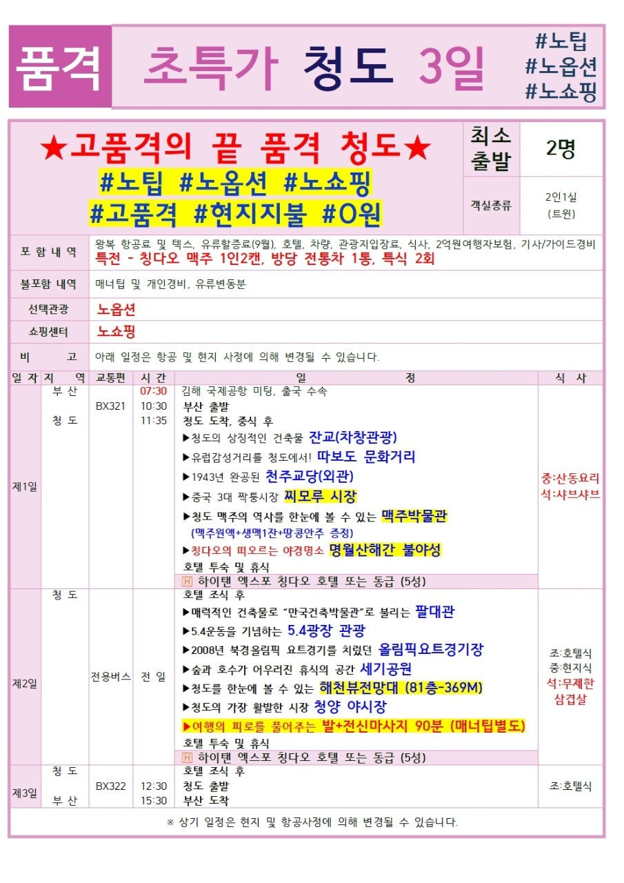 - 가격: 99,000원 (특식 2회 포함 / 쇼핑 포함)