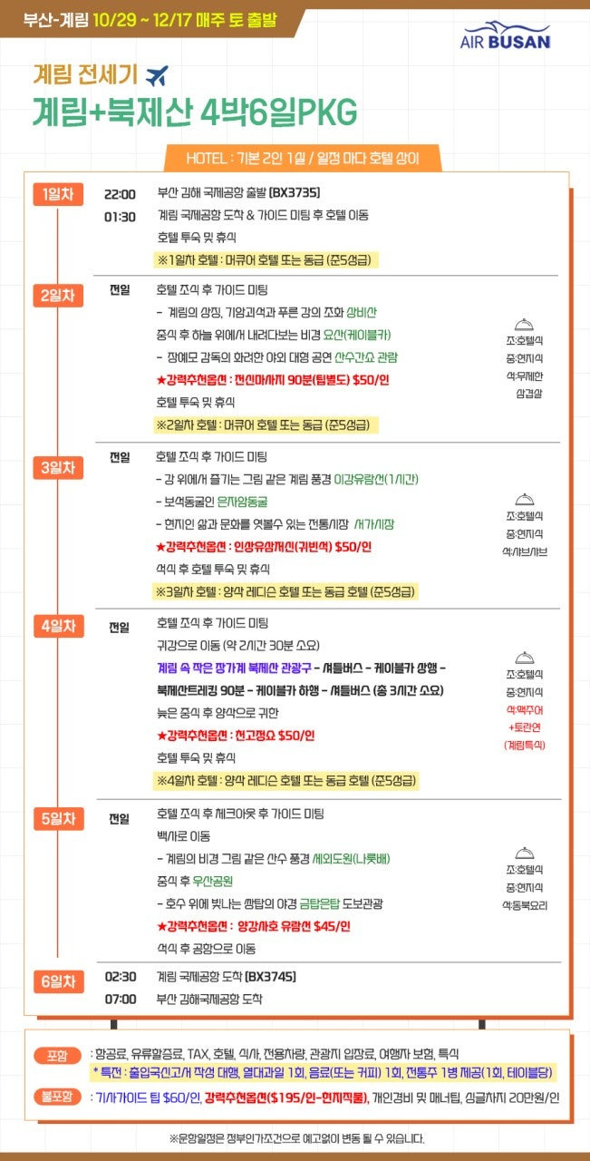 | 에어부산(BX) 계림 직항 전세기 ✈ 3박5일·4박6일 올포함 효도여행 (0) | 2025.09.01 |