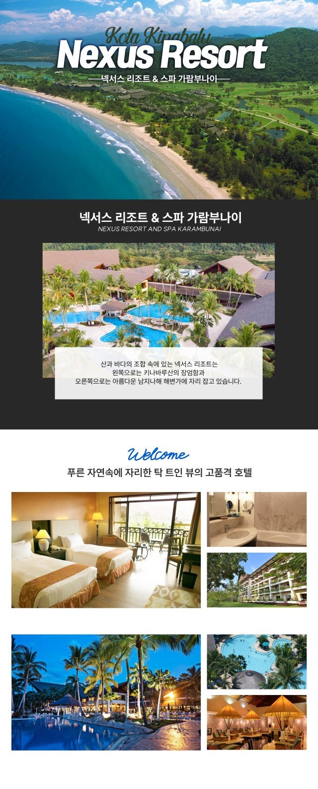 넥서스 리조트는 코타키나발루에서 가장 유명한 휴양 리조트 중 하나로, 넓은 비치라인과 아름다운 산책로가 매력적입니다.