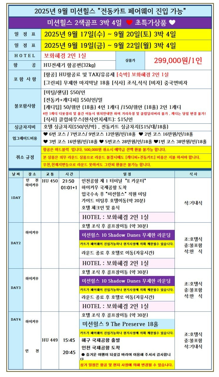 [인천출발해외골프] 9월 미션힐스 단독 골프 3박4일 – 299,000원 무제한 라운드 본문