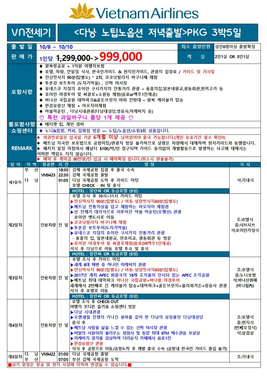 다낭 3박5일 ✈ 부산출발 노팁·노옵션 패키지 999,000원 (10/6 단 하루) 본문