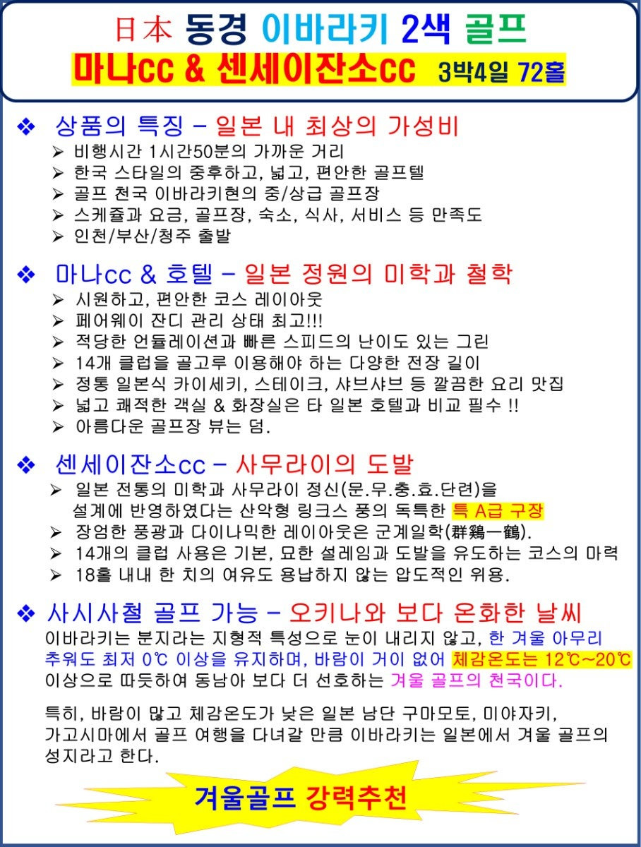 - #추석연휴골프 #청주출발골프 #인천출발골프 #이바라키골프 #일본골프투어 #록힐CC #마나CC #온천리조트골프 #일본프로테스트코스 #가성비골프여행 #2색골프투어 #해피투어 #이지숙실장