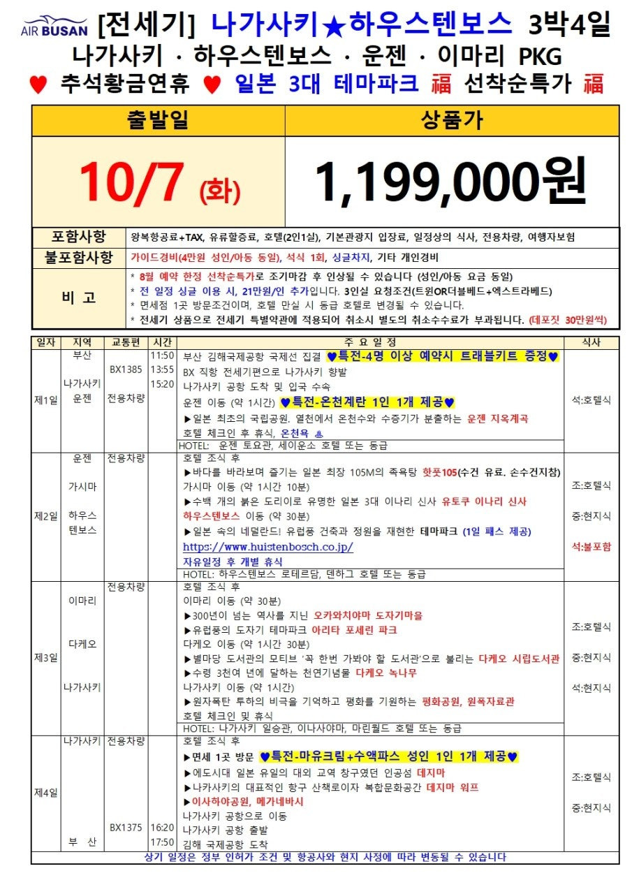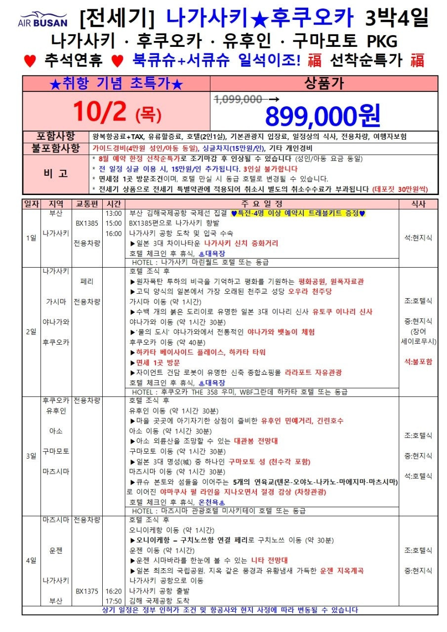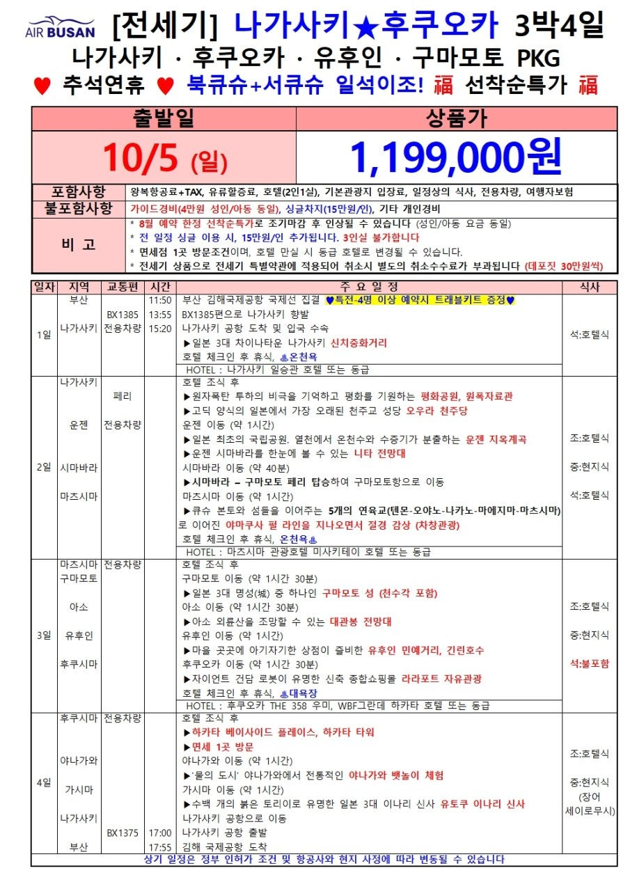 📌 [부산→나가사키 전세기특가] 10/1 단 하루! 999,000원에 떠나는 나가사키 3박4일