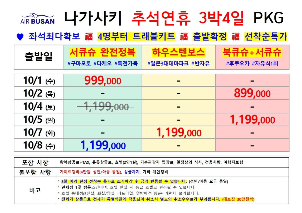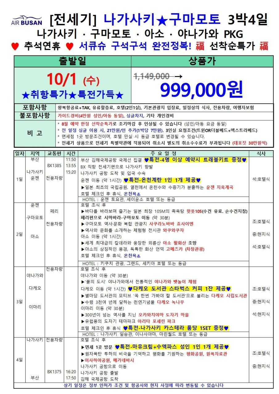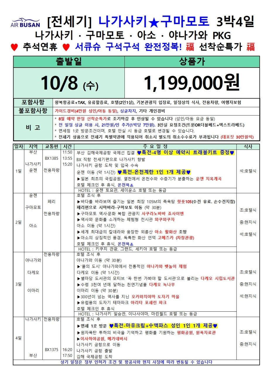 📌 [부산→나가사키 전세기특가] 10/1 단 하루! 999,000원에 떠나는 나가사키 3박4일