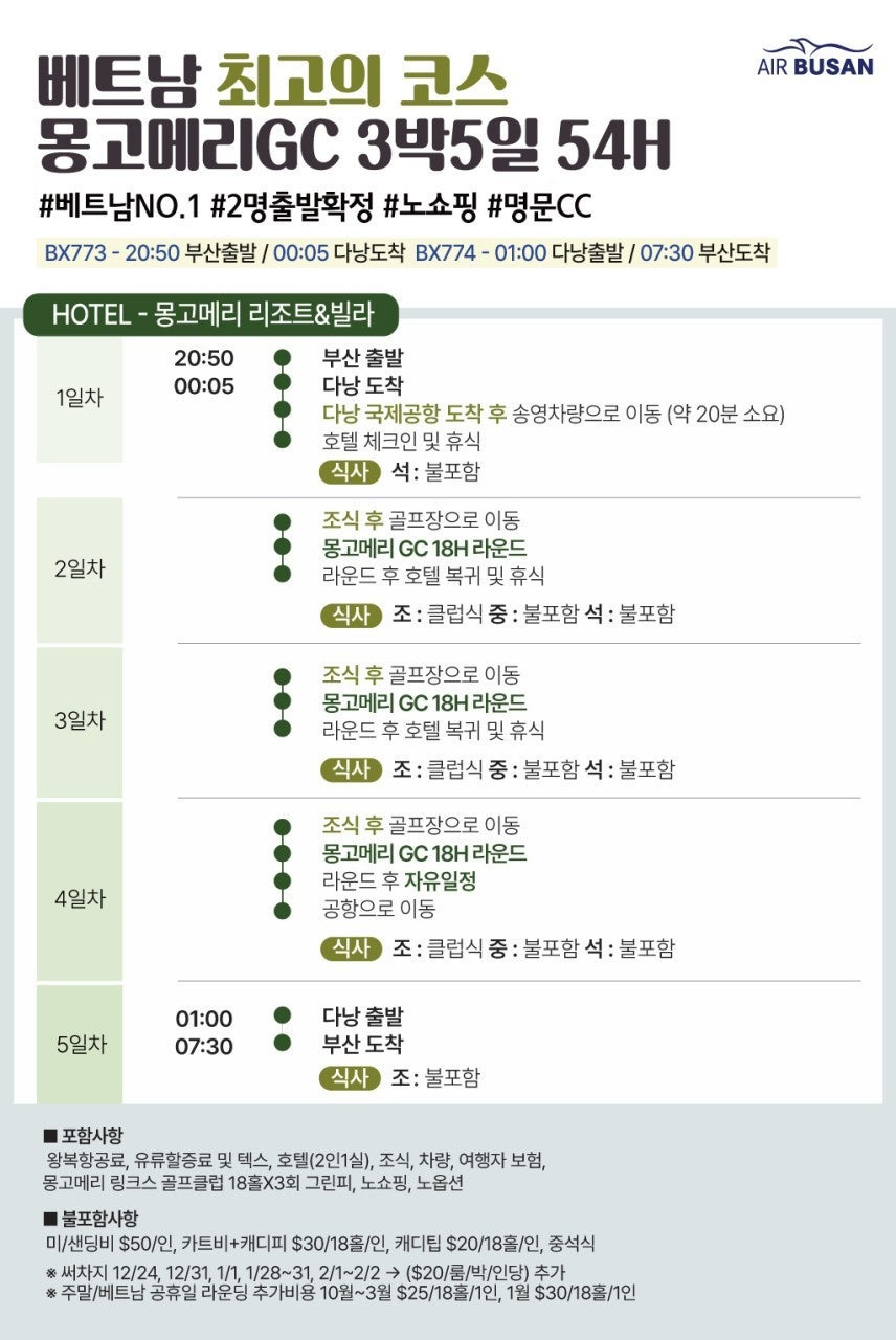 | ♣ 인천출발 연휴특가 골프투어 후기 ♣ – 맹글로브 CC & 미션힐 Shadow Dunes 3박4일/4박5일 (1) | 2025.09.23 |