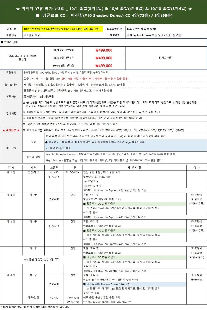 ♣ 인천출발 연휴특가 골프투어 후기 ♣ – 맹글로브 CC & 미션힐 Shadow Dunes 3박4일/4박5일 본문