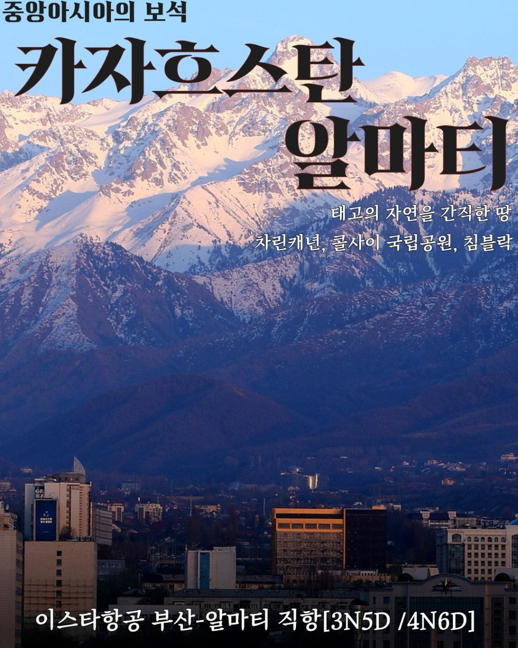 #부산출발해외여행 #알마티여행 #이스타항공 #카자흐스탄여행 #부산출발직항 #알마티관광 #천산산맥 #차린캐년 #젠코바성당 #질료니바자르 #콜사이호수 #아시아의스위스 #부산출발패키지