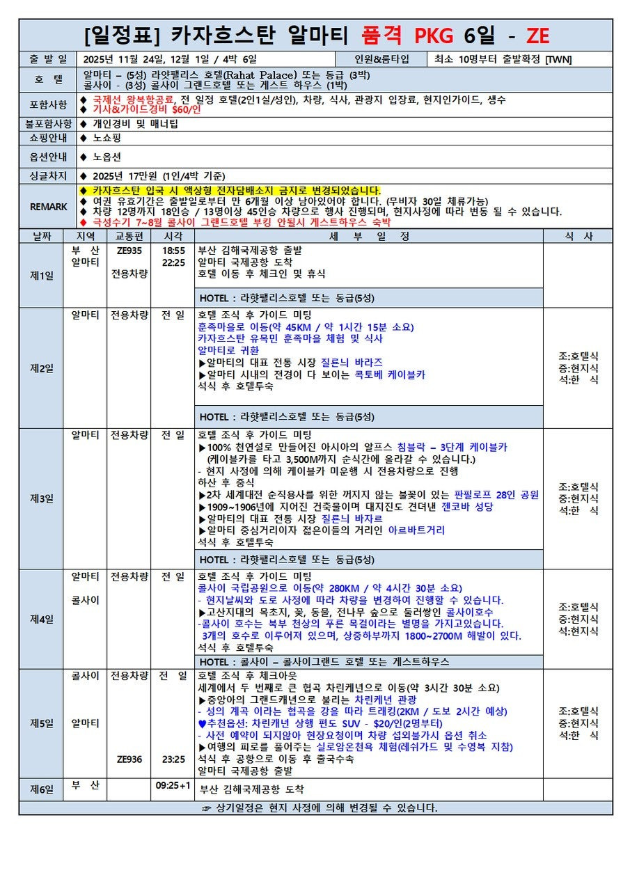 ✔️ 확장 일정 : 부산 출발 – 부산 리턴, 7박 9일 카자흐스탄+키르기스스탄 2개국 연계 가능