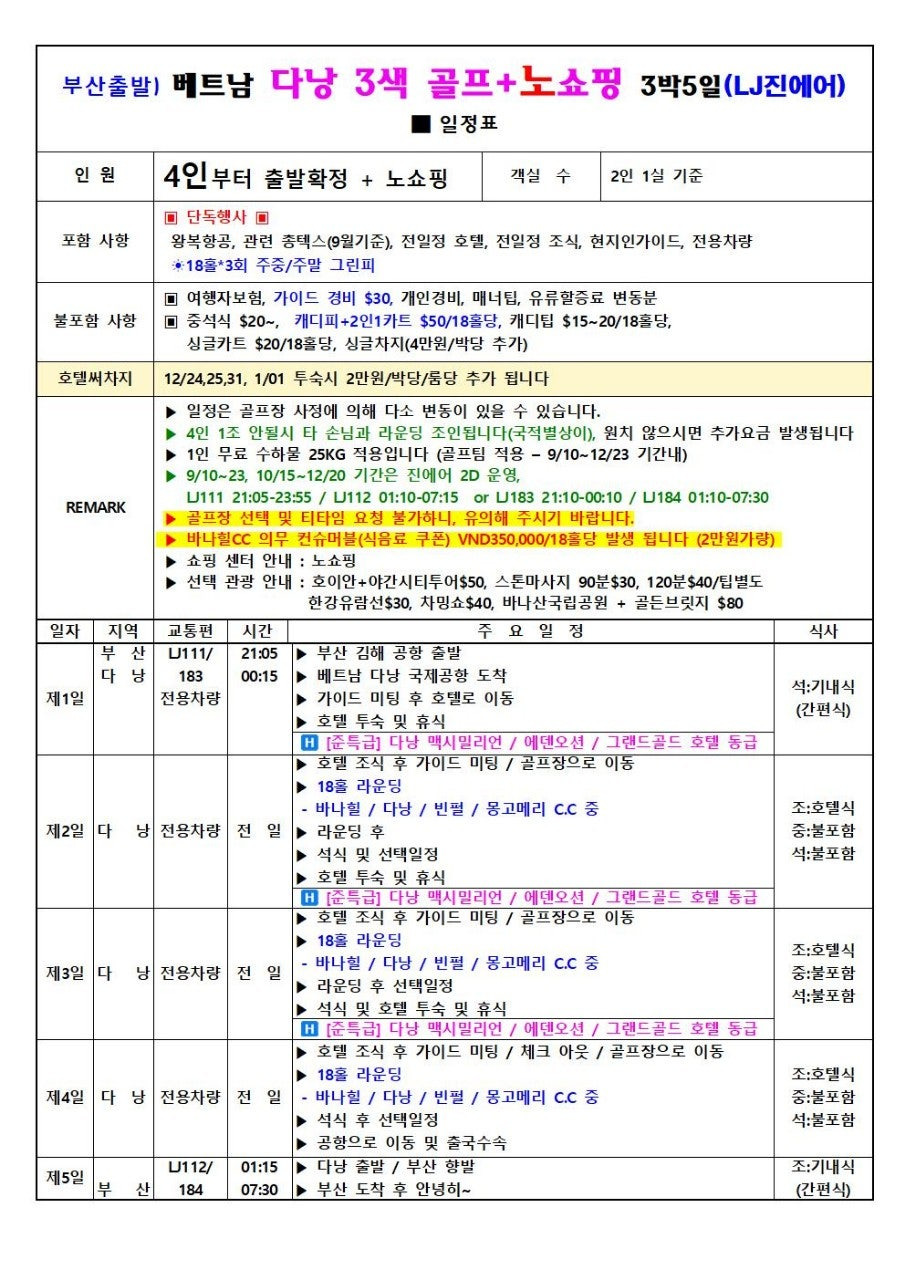 2) **다낭 3색 + 노쇼핑 (4명 이상 출발)**