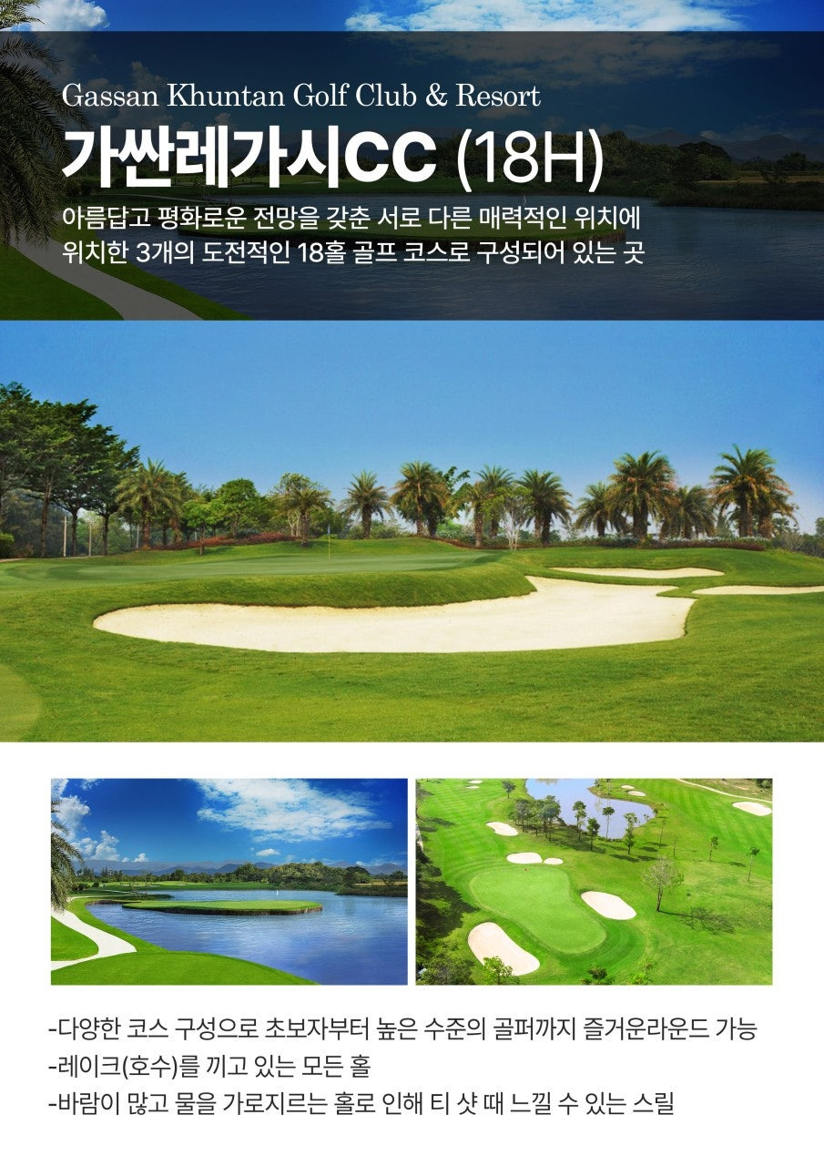 ⛳ 가산 레가시 코스 개요: 태국 북부 람푼 지역에 위치한 이 코스는, 물과 벙커가 조화롭게 배치되어 있어 매 홀 섬세한 코스 공략이 요구되는 명문 코스입니다. 실력 향상을 위한 최적의 환경을 제공합니다.