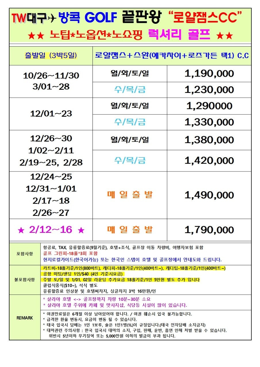 - 코스 혁신: 로얄 젬스, 스완, 로즈 가든 등 방콕 명문 3색 골프장 이용! (니칸티CC 추가 문의 가능)