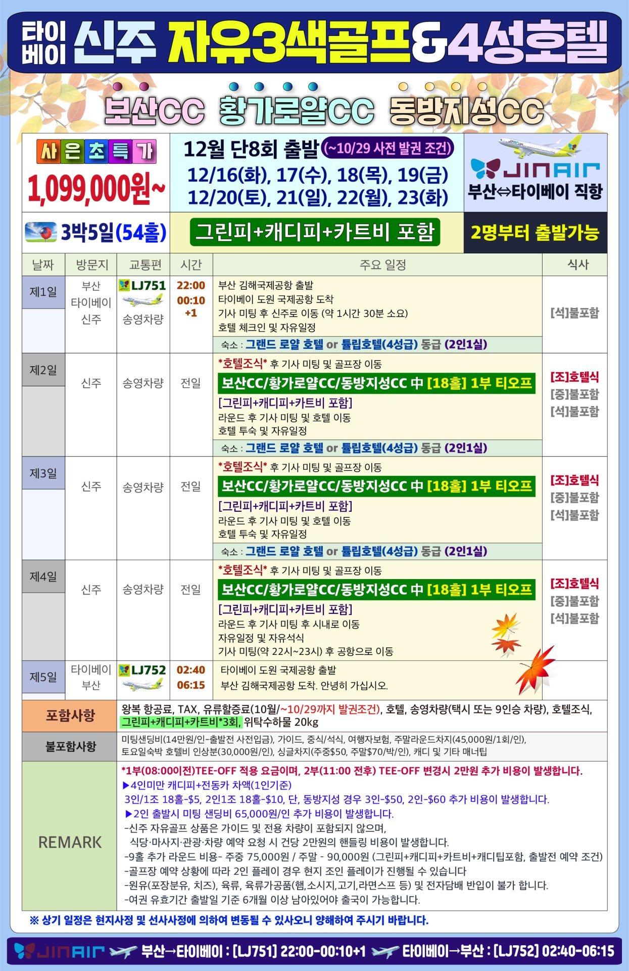 해피투어의 신주 3색 골프 패키지는 1,099,000원에 골프 경비(그린피+카트비+캐디피+캐디팁)