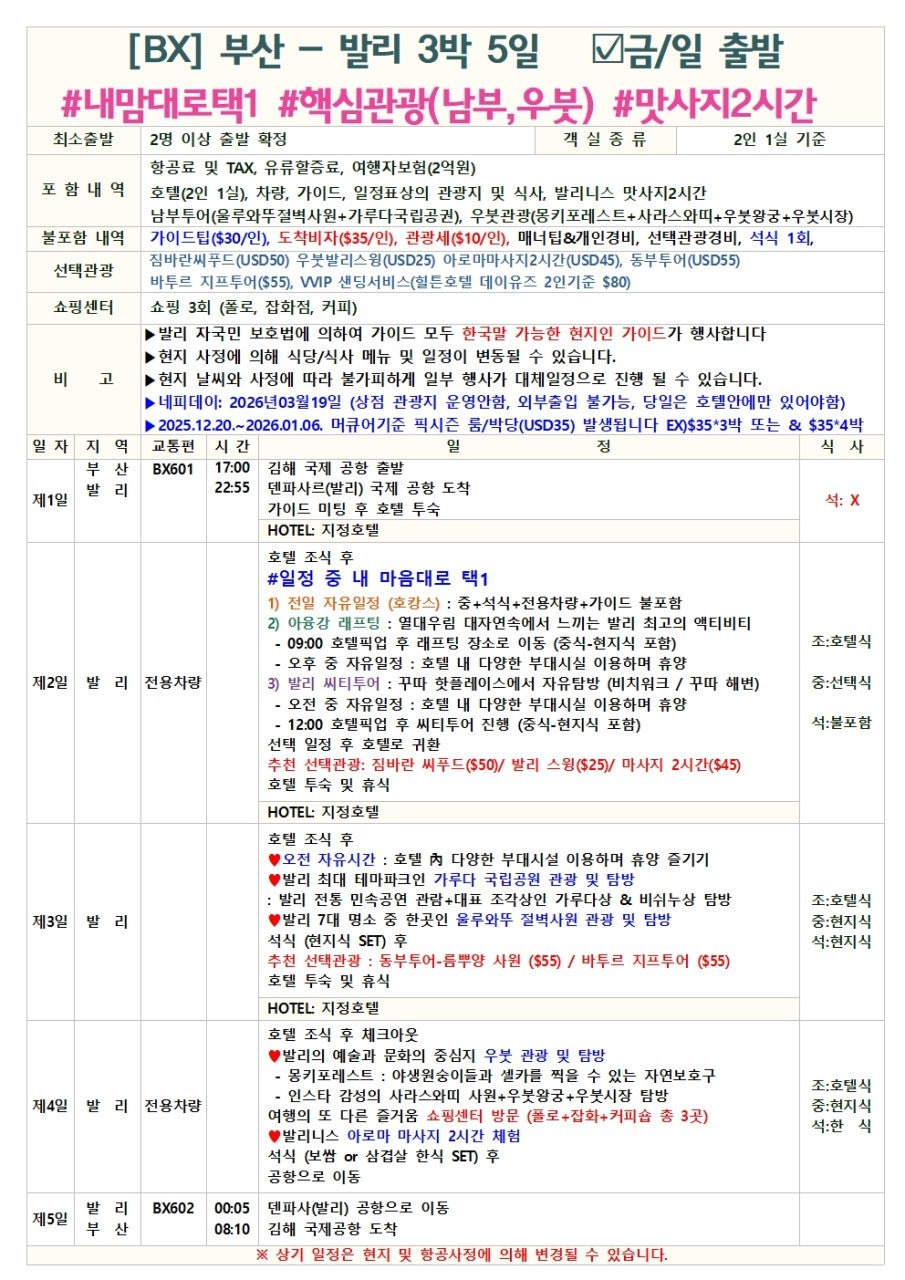 #발리여행분석 #내맘대로발리 #머큐어레기안 #부산직항특가 #아융강래프팅 #호캉스패키지 #10월29일마감 #여행보험확대 #발리입국정보 #티스토리여행 #발리마사지 #발리관광세 #우붓여행 #발리특가 #해피투어 #부산출발해외여행추천 #부산출발해외여행 #부산직항해외여행 #해피투어 #특가해외여행 #땡처리해외여행 #부산패키지