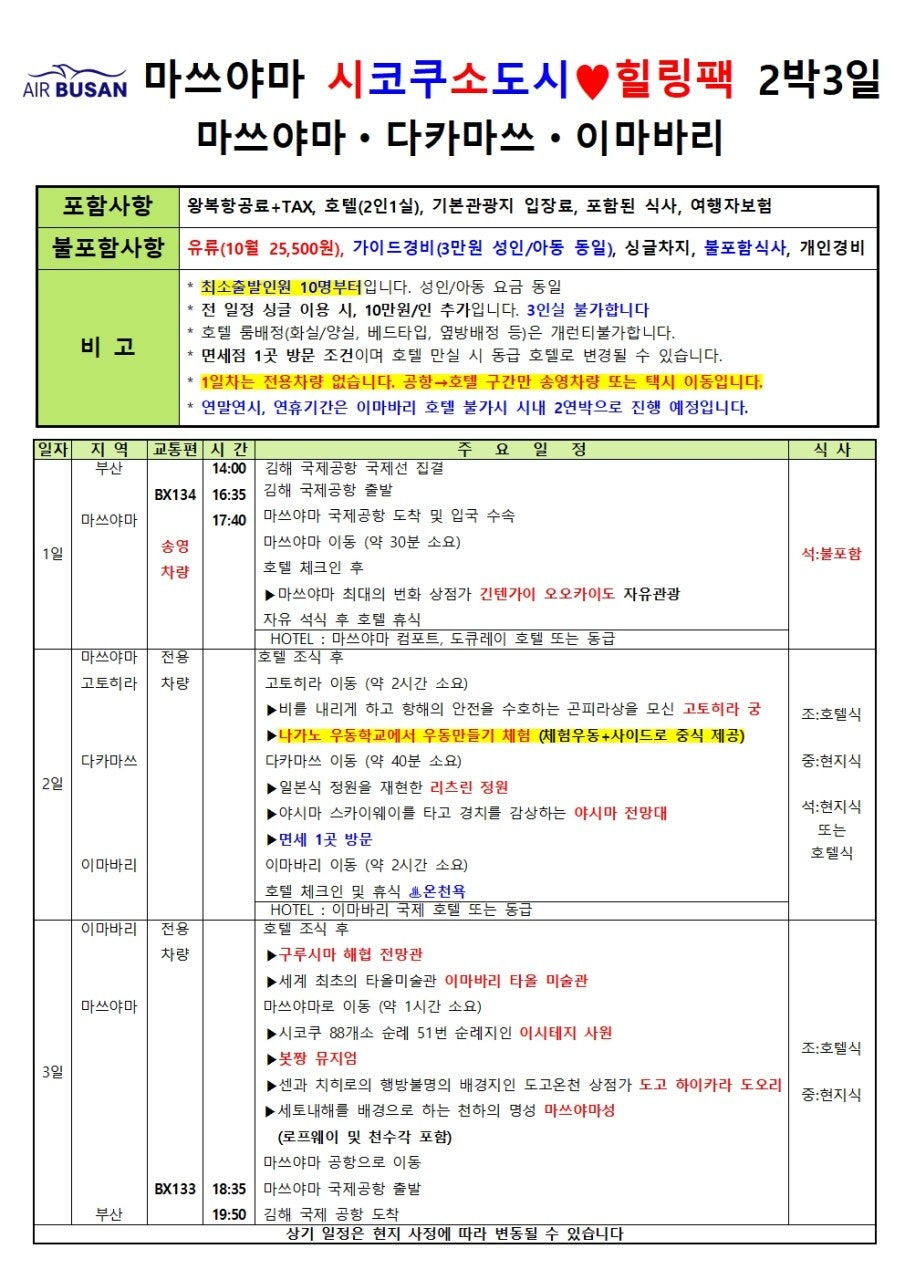 - ✈️ 최고의 시간 효율: 부산에서 마쓰야마까지 비행시간 단 1시간 5분! 여유로운 오후 출발/도착 (중중 패턴) 스케줄로 첫날부터 마지막 날까지 알차게!