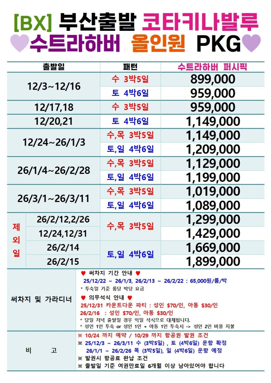 ✈ 항공 스케줄의 이점: 에어부산 야간 스케줄(19:05 부산 출발)은 퇴근 후 출발이 가능하며, 새벽 복귀(06:30 부산 도착)로 연차 소모를 최소화합니다. 수/토 (3박 5일/4박 6일) 및 목/일 (3박 5일/4박 6일) 패턴 선택이 가능하여 일정 계획이 매우 유연합니다.