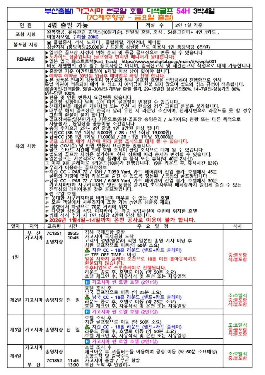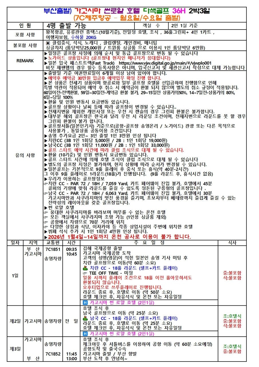 | 편의성 | 2인 이상 출발 가능 | 소규모 그룹 및 부부 골프 여행 최적화 | 오전 출발/오후 도착 황금 스케줄 |
