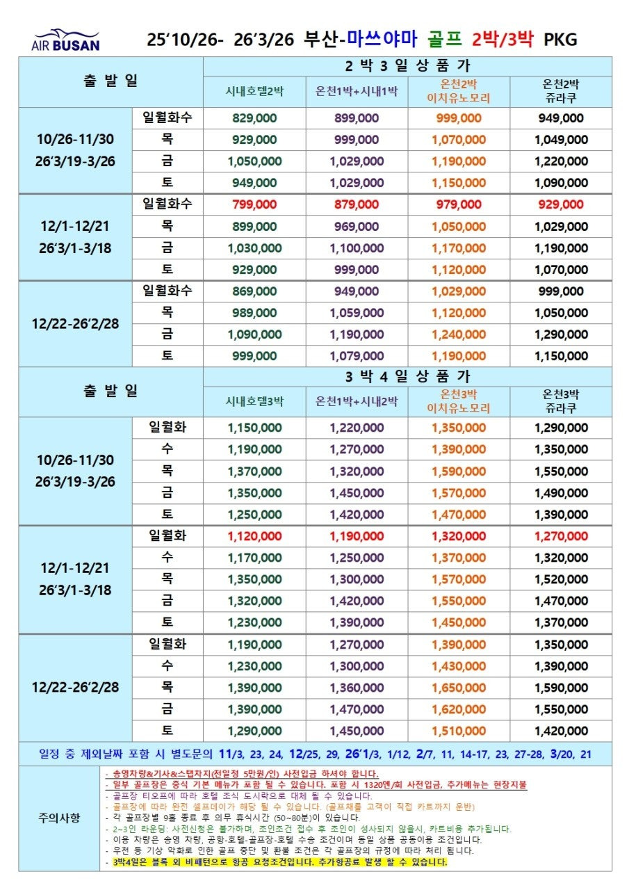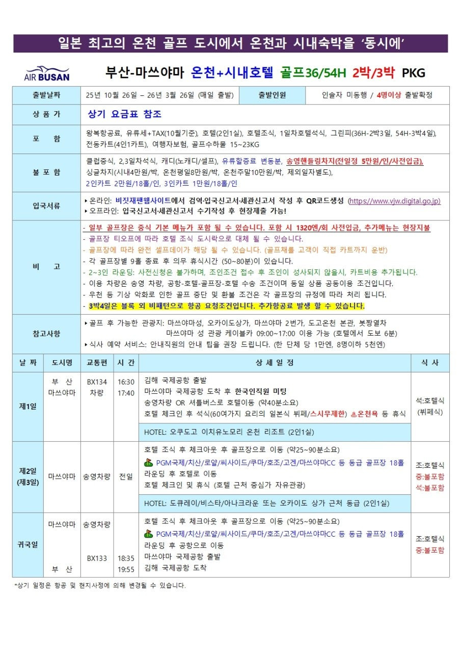 | 항공/접근성 | 에어부산 단독 직항, 10/25부터 매일 출발 | 부산 출발 고객에게 최고의 편리성 제공 | 2박 3일(데일리), 3박 4일(주말) 패턴 |