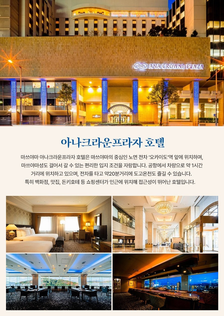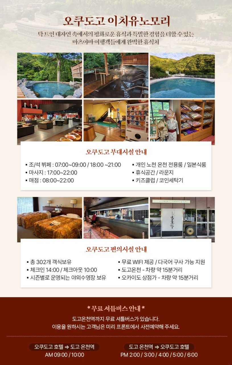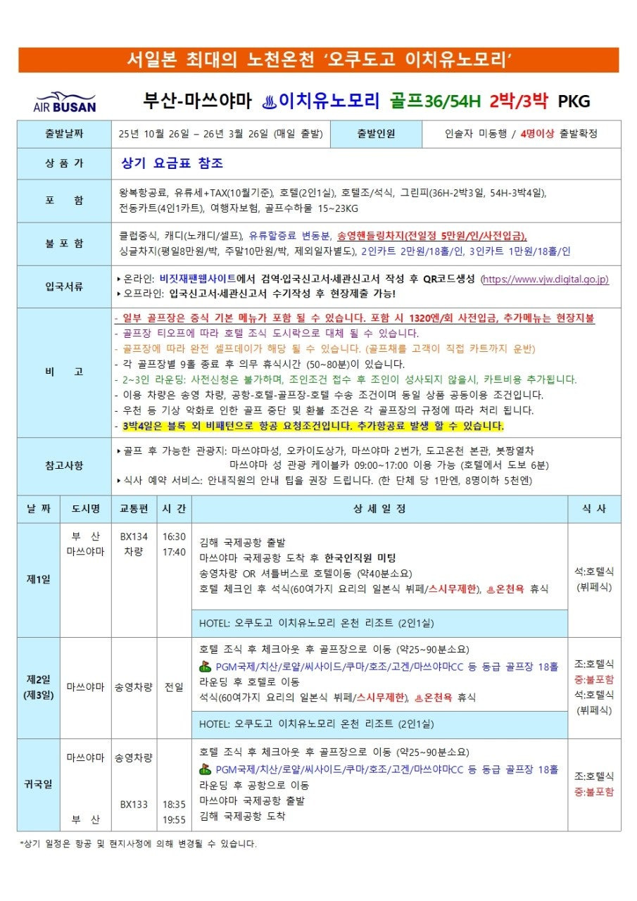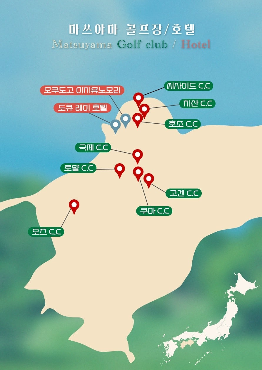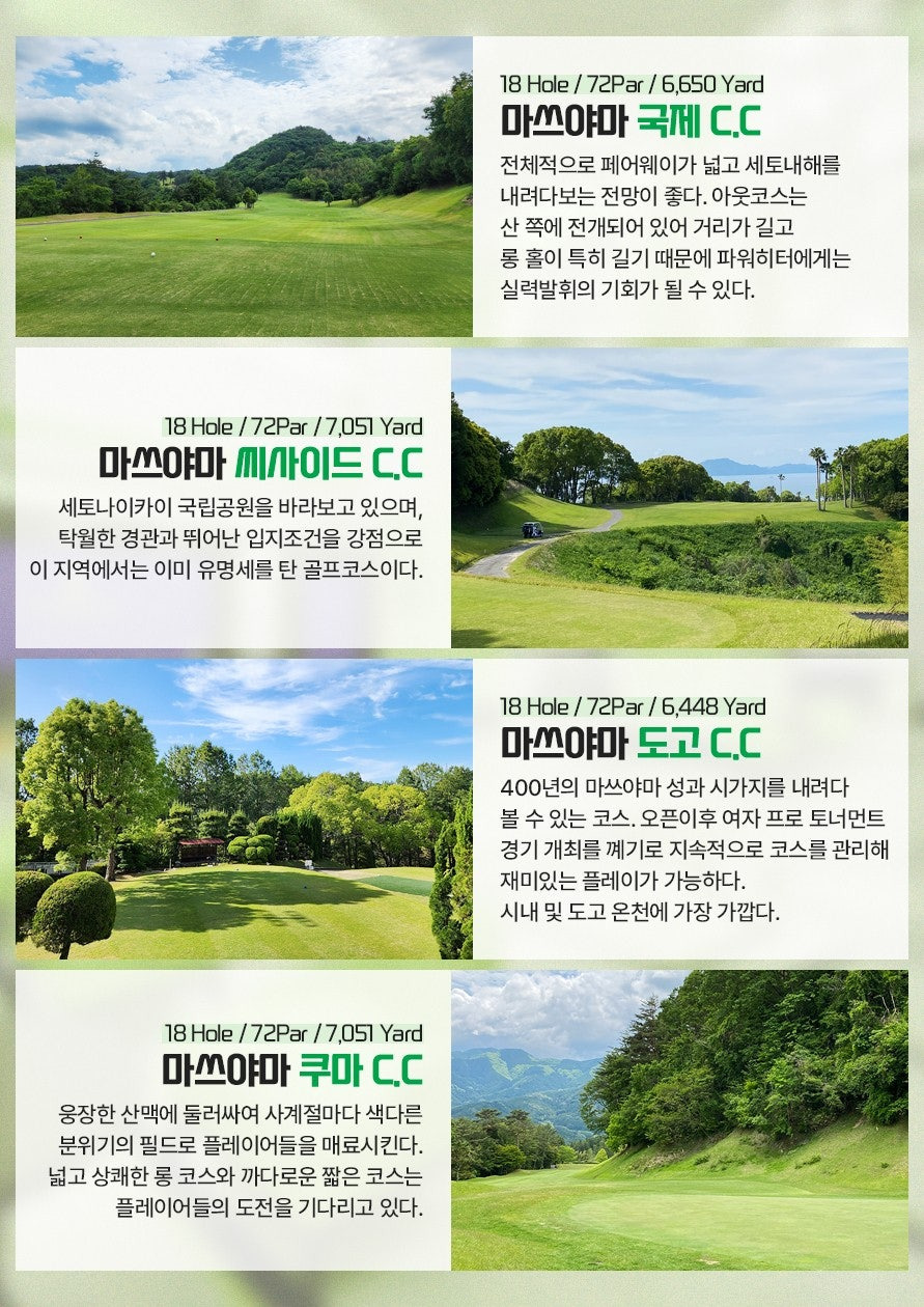 | 숙박 혜택 | 온천호텔 (오쿠도고, 쥬라쿠 등) 숙박 선택 가능 | 라운딩 후 피로를 녹이는 고품격 온천 힐링 보장 | 시내/리조트 등 다양한 옵션 제공 |
