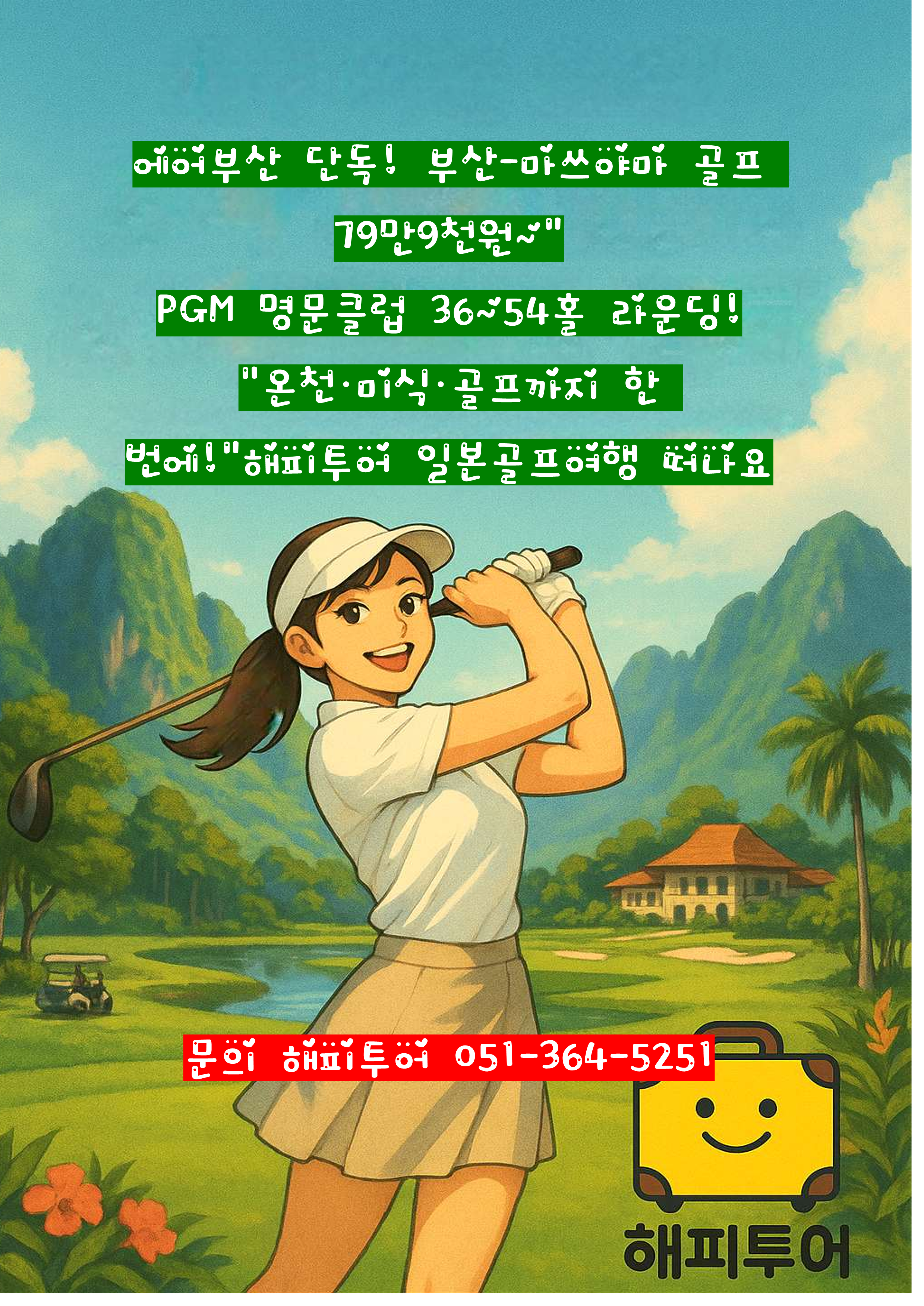해피투어의 마쓰야마 골프 패키지는 79만 9천원부터 시작하는 가격에 PGM 명문 코스 라운딩과 온천호텔 힐링을 결합한 최적의 상품입니다.
