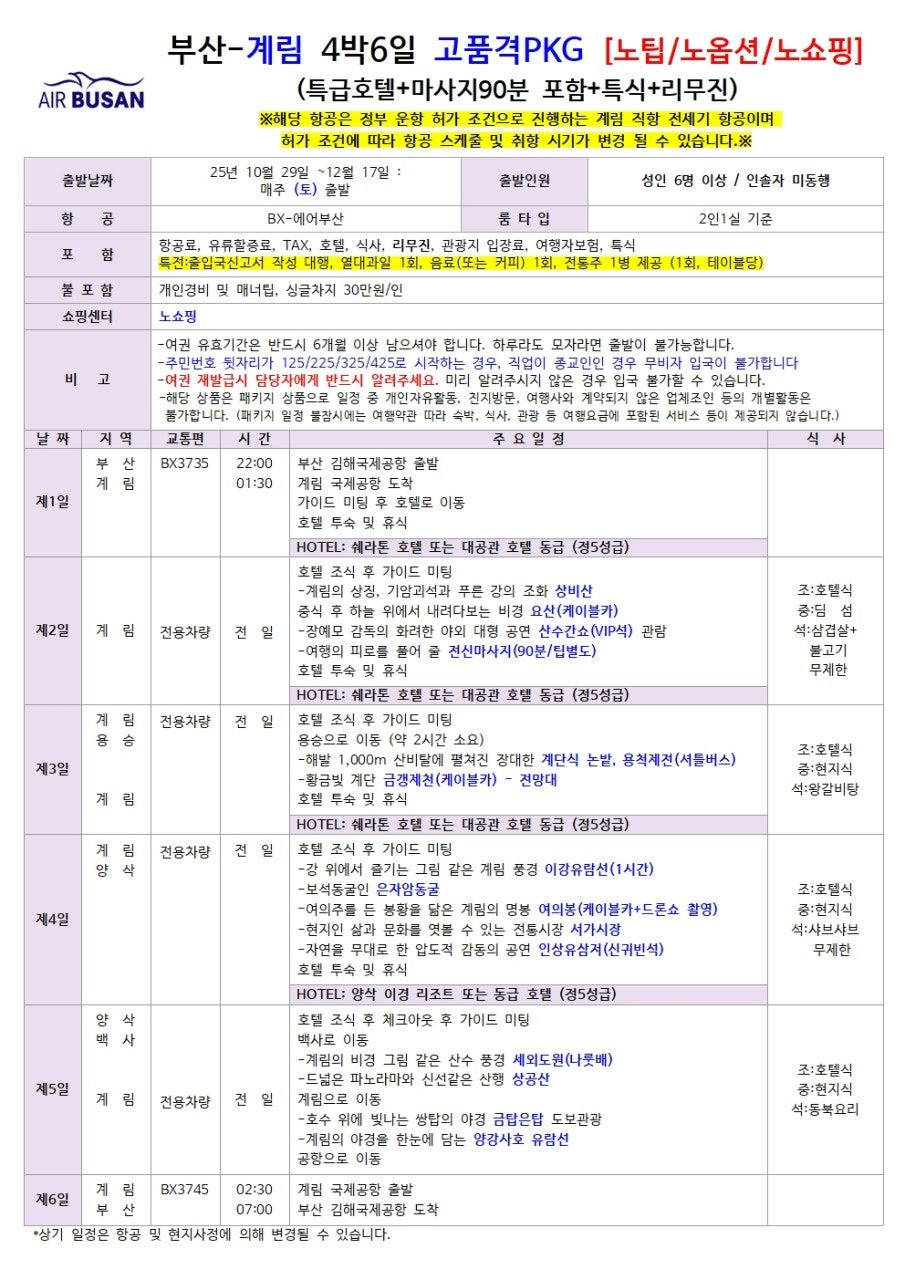 - ✈️ 직항 단독 운항: 에어부산 전세기로 부산에서 계림까지 경유 없이 가장 편안하고 빠르게! (단, 10/29~12/17 운항)