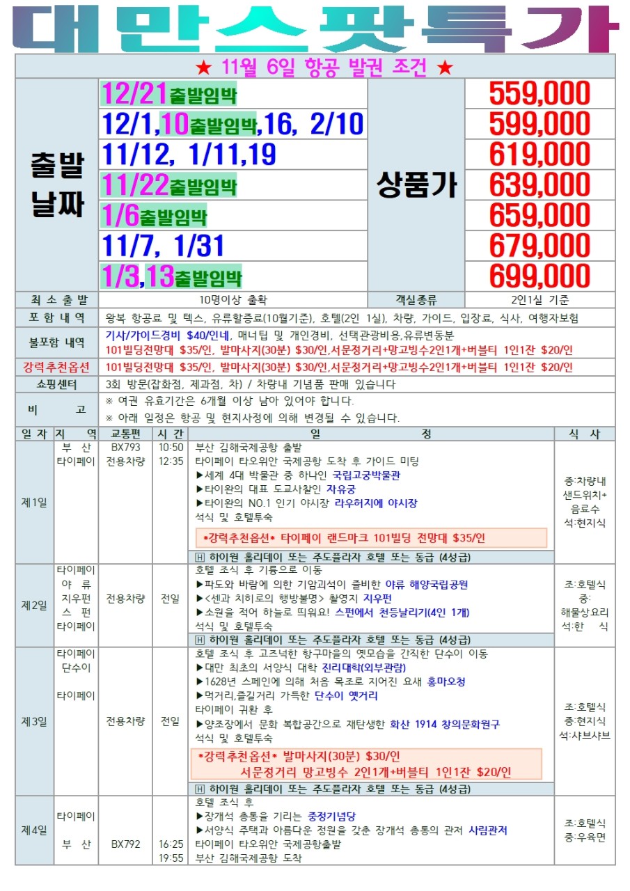 해피투어의 타이베이 스팟 특가는 11월부터 2월까지 대만을 여행하기 가장 좋은 쾌적한 계절에 맞춰 진행됩니다.
