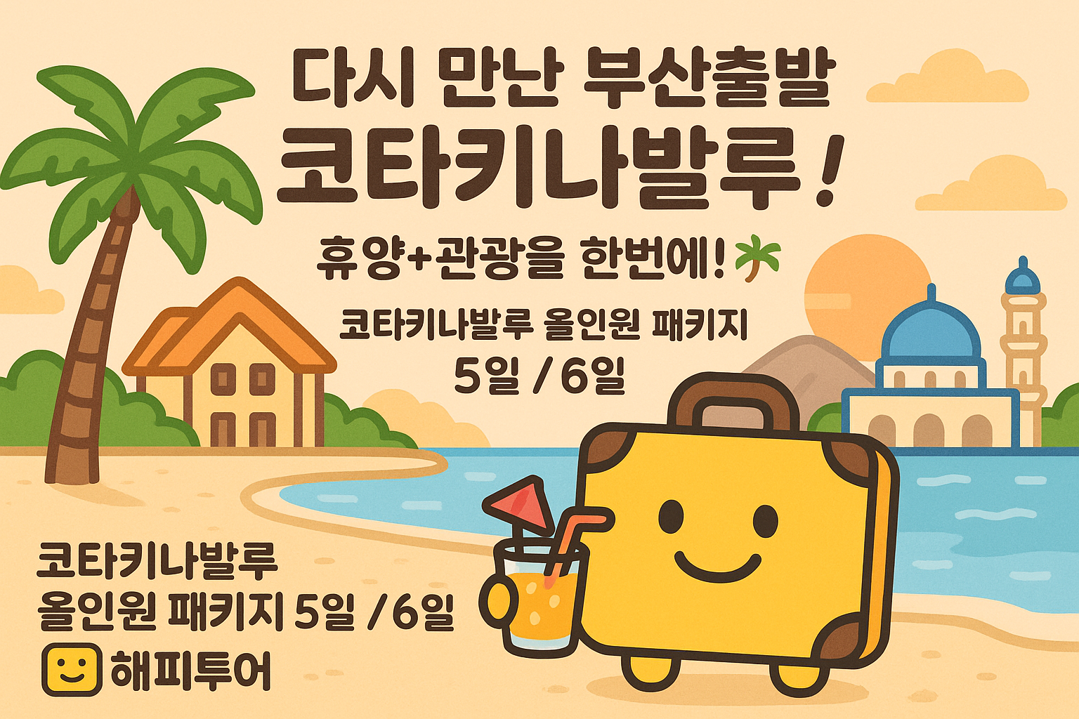 해피투어의 올인원 PKG는 휴양과 관광을 한 번에, 그리고 여유와 체험을 꽉 잡은 진정한 휴양 상품입니다.