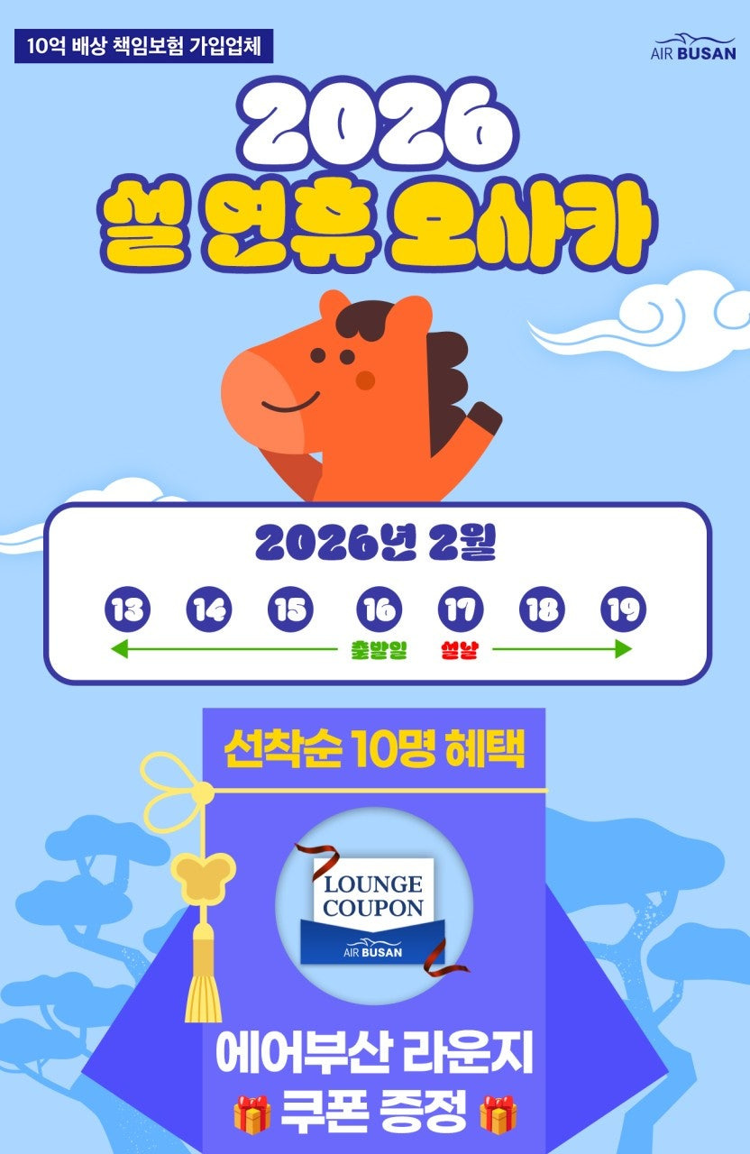 각 날짜 선착순 10명에게 에어부산 라운지 쿠폰 증정! 설 연휴의 시작을 공항 라운지에서 편안하게 시작하세요.
