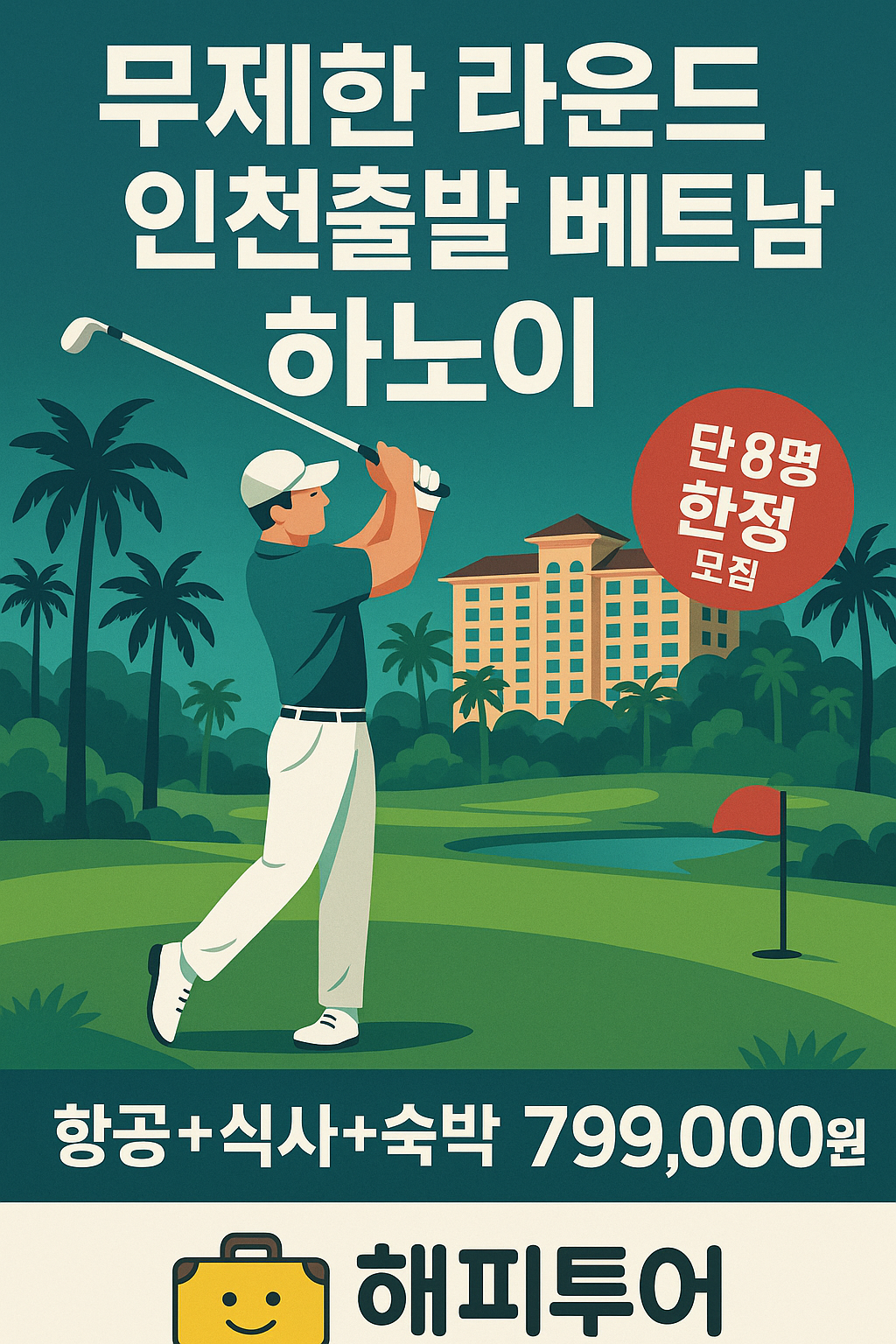 해피투어가 현지 파트너 사장님이 시원하게 질러주신 단 한 번의 초청 사은 특가를 선보입니다. 799,000원이라는 믿을 수 없는 가격에, 그린피 무제한 혜택을 누릴 수 있는 8인 한정 프리미엄 기회입니다.