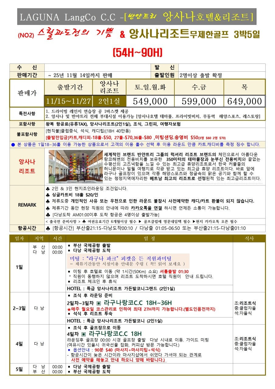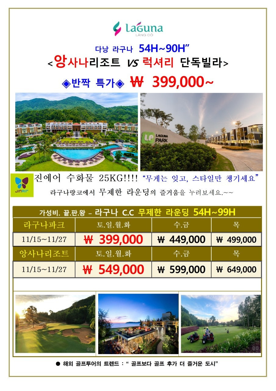 | 항목 | 라구나 파크 골프전용 빌라 (399,000원~) | 특1급 앙사나랑코 리조트 (549,000원~) | 전략적 가치 |