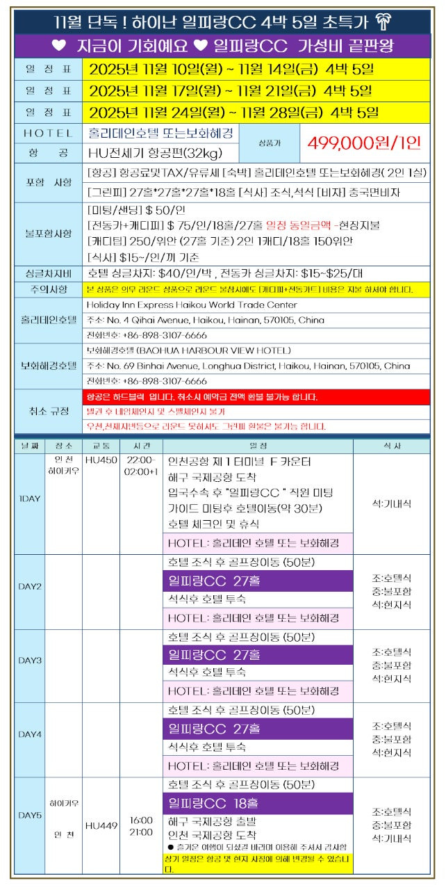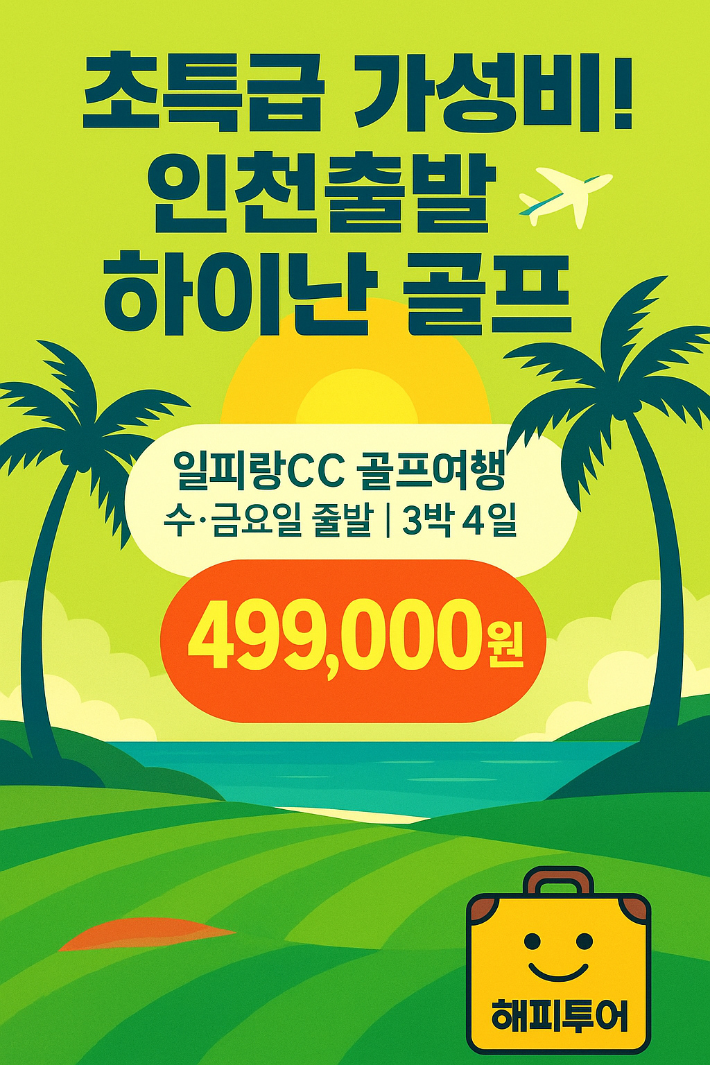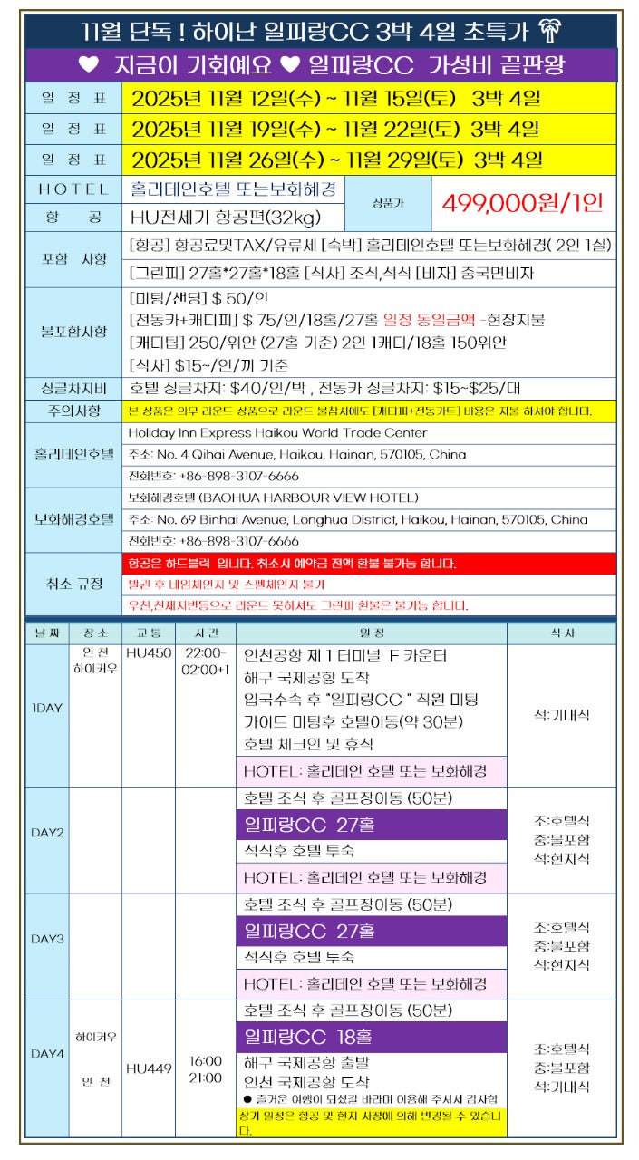 해피투어의 일피랑CC 초특가는 499,000원에 HU항공 직항을 이용하며, 3박 4일 72홀 또는 4박 5일 99홀 라운딩을 제공합니다.