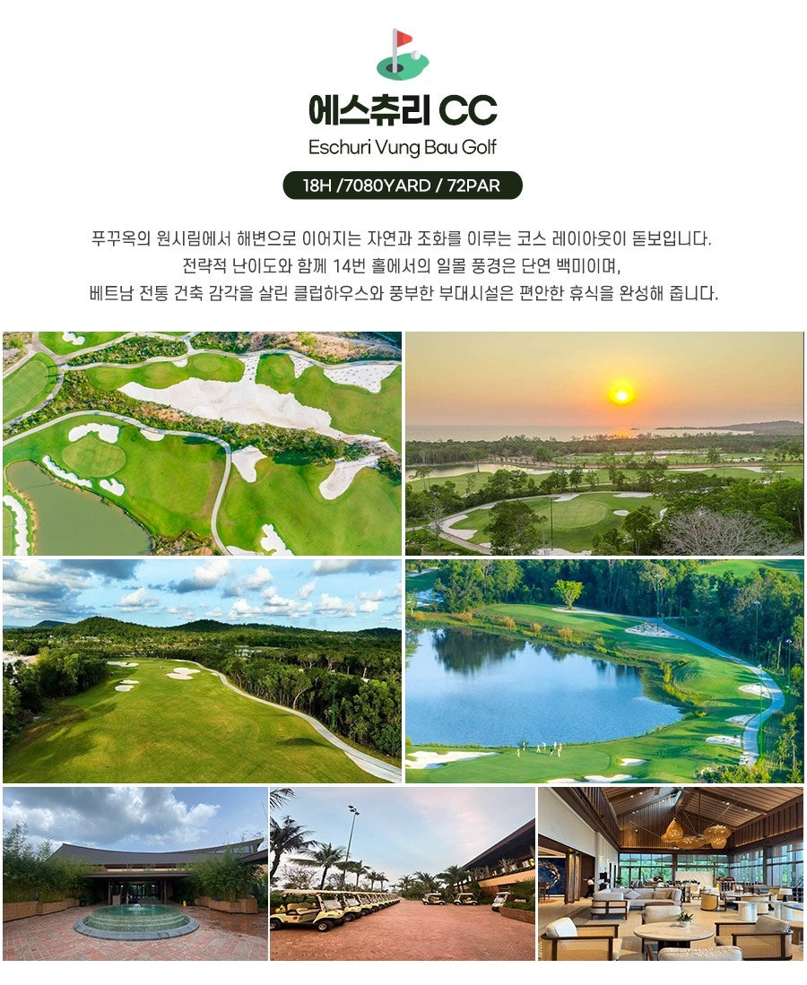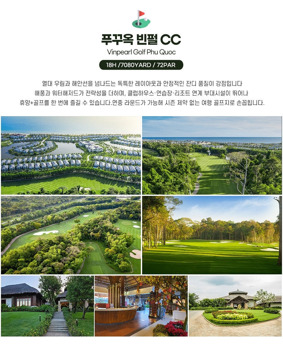 - ⛳ 코스 넘버원: 빈펄 CC 중에서 코스 넘버원으로 손꼽히는 푸꾸옥 빈펄 CC와 또 다른 명문 코스를 엮은 2색 라운딩으로 재미와 만족도 모두 2배!
