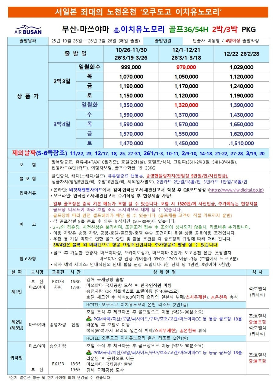 - ♨️ 온천 힐링: 라운딩 후 오쿠도고, 이치유노모리, 쥬라쿠 등 인기 온천호텔에서의 힐링 타임이 포함! 골프 피로를 3000년 온천의 정기로 풀어드립니다.