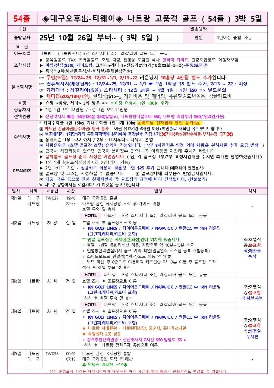 #대구출발나트랑 #티웨이직항 #5성급골프 #나트랑3색골프 #빈펄CC #KN깜란 #다이아몬드베이 #롱손사 #나트랑시내관광 #해피투어 #이지숙실장 #고품격골프 #12월1일마감 #해외골프 #여행핫딜#대구출발해외골프추천 #대구출발해외골프 #대구직항해외골프#해피투어 #특가해외골프#땡처리해외골프#부산