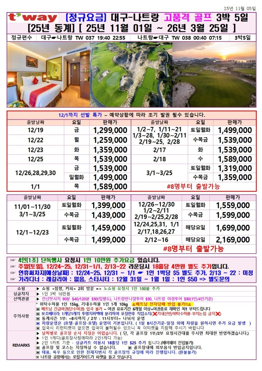 12월 1일 선발 요금 마감 임박! 이 날짜가 지나면 요금이 변동됩니다. 8명부터 출발 가능하며, 4명 출발 시 추가 요금이 있으니 지금 바로 팀원을 모아 문의하세요!