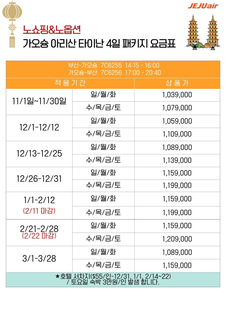 | 운항 스케줄 | ➡️ 부산(PUS) - 가오슝(KHH): 7C6255 14:15 출발 - 16:00 도착 ⬅️ 가오슝(KHH) - 부산(PUS): 7C6256 17:00 출발 - 20:40 도착 ✅ 피로하지 않은 황금 스케줄! |