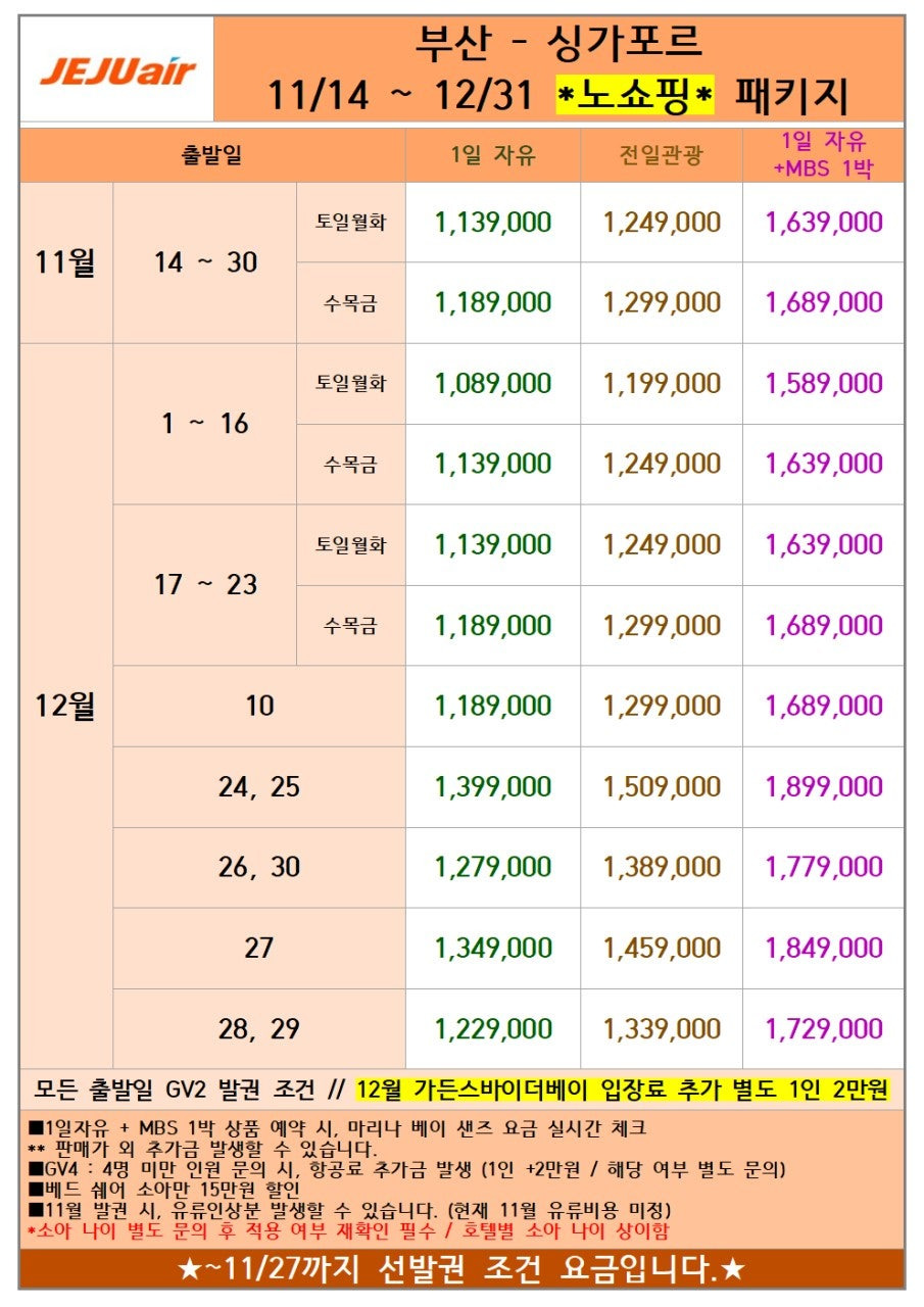 | 11/14~30 | 수/목/금 | 1,189,000원 | 1,299,000원 | 1,689,000원 |