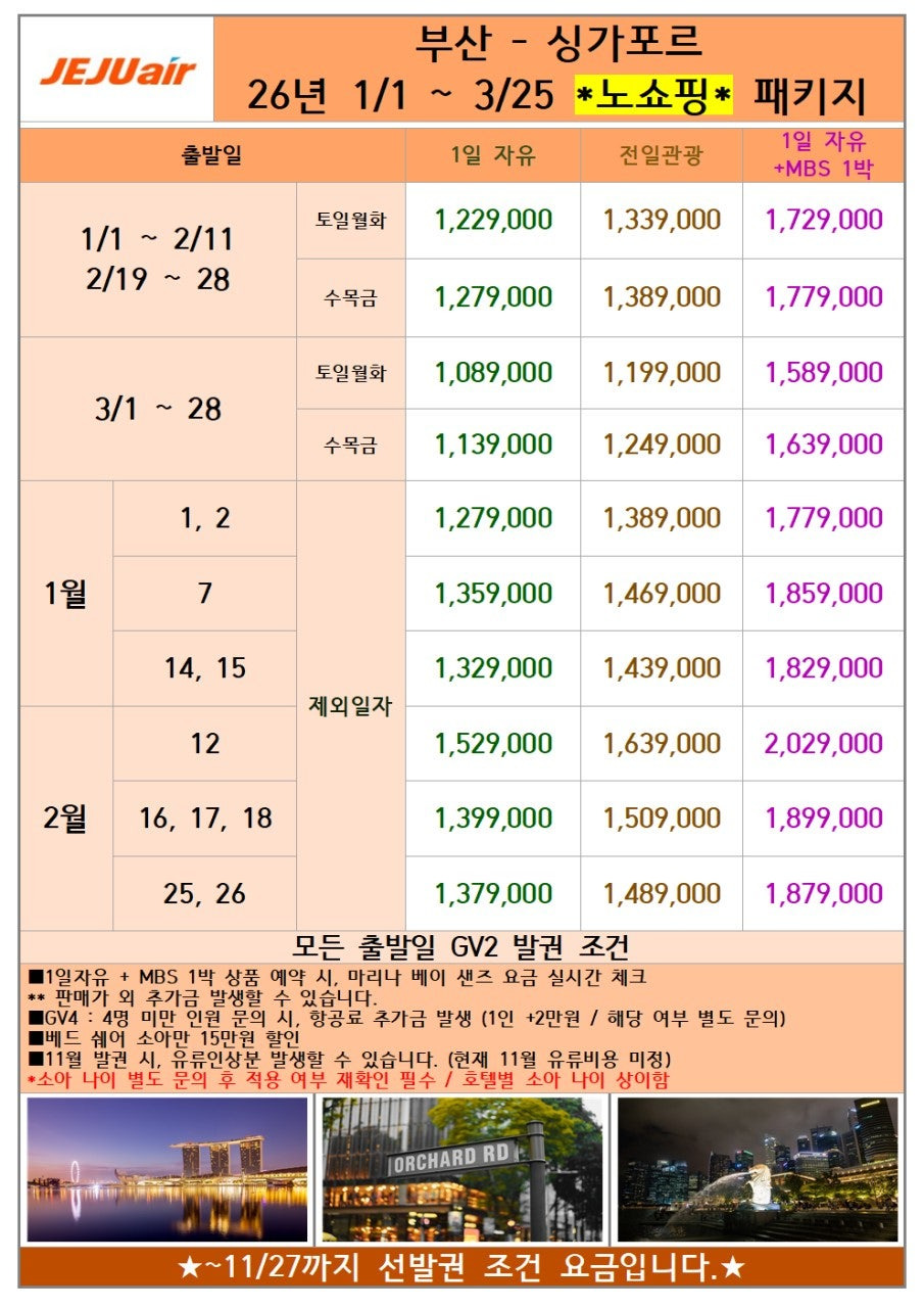 추운 겨울을 피해 따뜻하고 안전한 여행지 싱가포르에서 특별한 휴가를 만드세요. 해피투어가 준비한 제주항공 부산-싱가포르 노쇼핑 패키지는 동계 스케줄 변동을 적용하여 더욱 저렴하고 알찬 요금으로 돌아왔습니다!