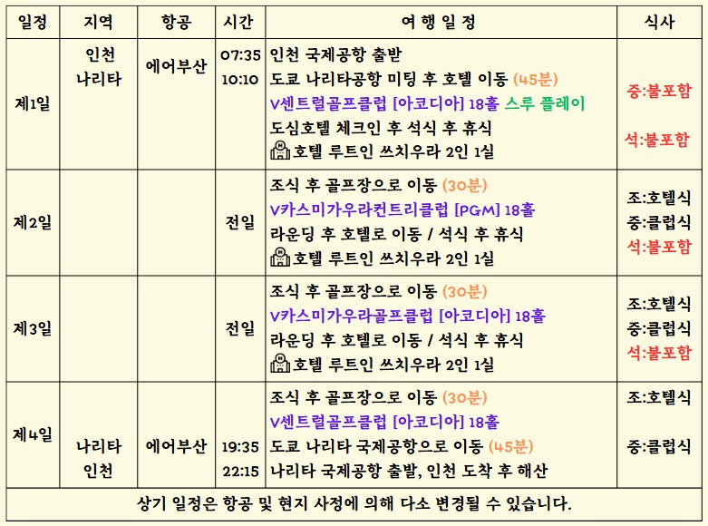 📅인천출발 3박 일정표(54홀&72홀)