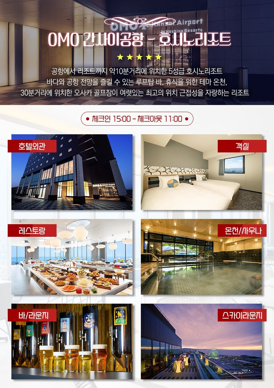 국내외 도시를 연결하는 간사이 국제공항에서 1역의 린쿠 타운 역에 있는 OMO 브랜드 최초의 에어포트 호텔. 공항 픽업 버스 등 편의성은 물론, 오사카만을 바라보는 하늘을 테마로 한 레스토랑과 반노천탕을 갖춘 대욕장 등 여행 사이를 즐겁게 보낼 수 있는 호텔