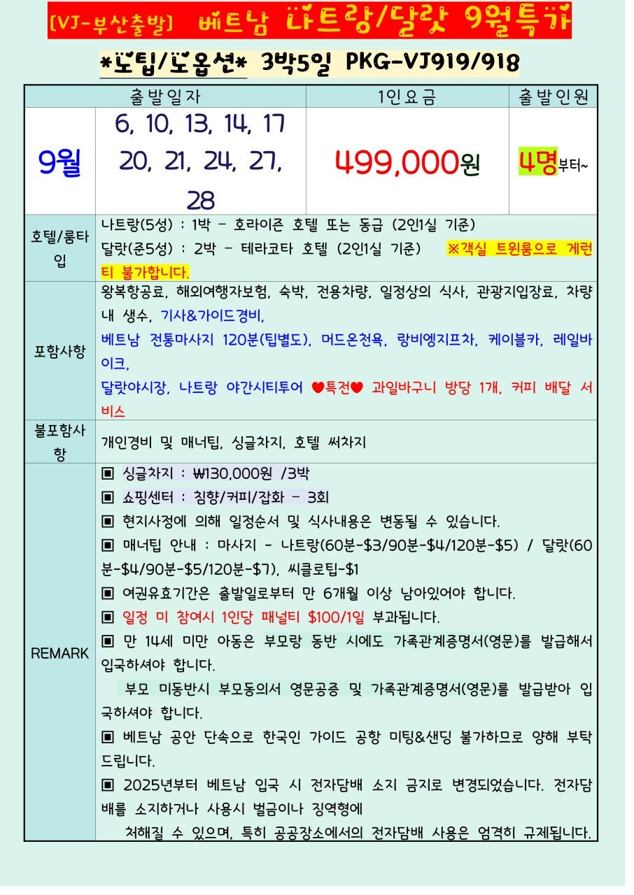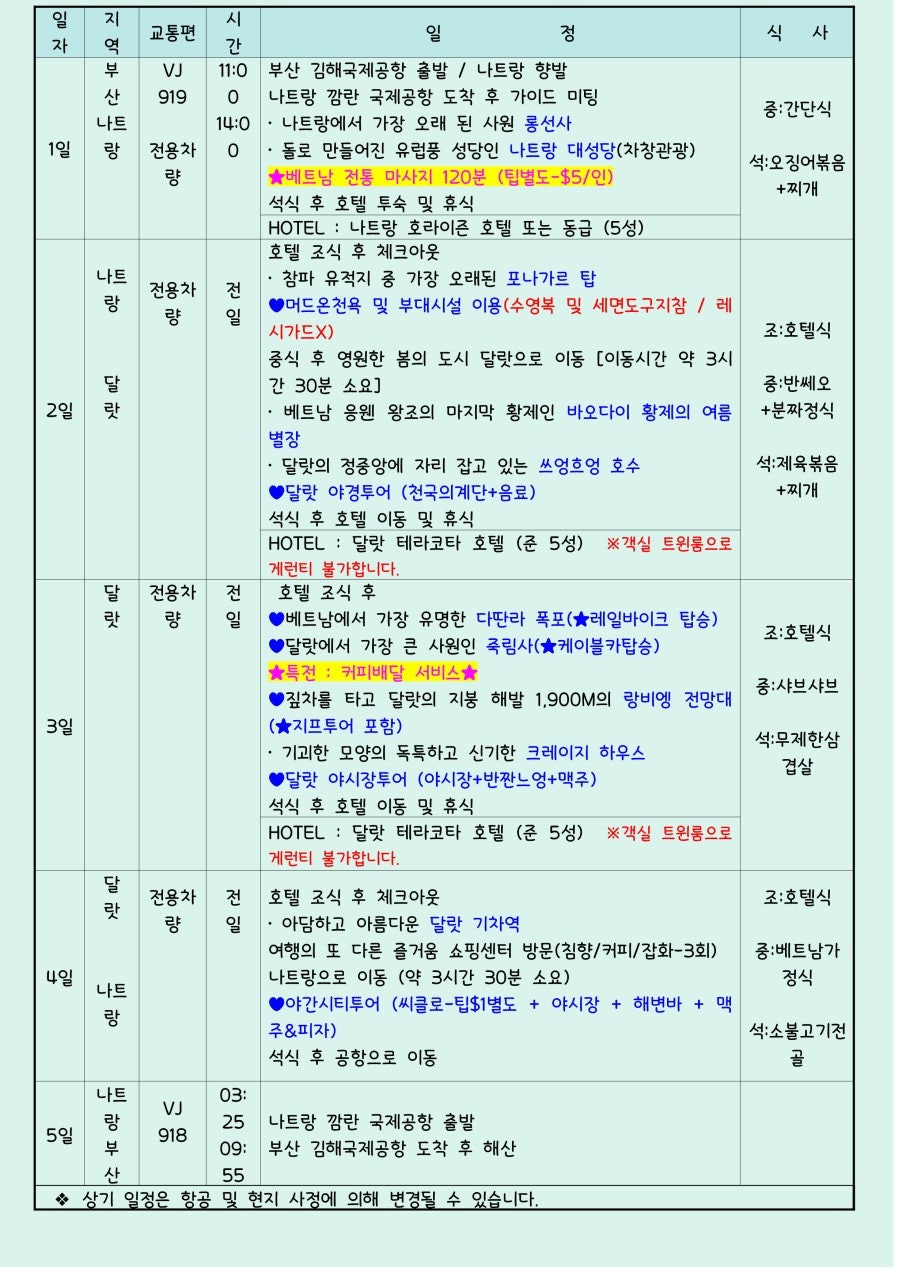 [9월 한정 특가] 부산출발 나트랑·달랏 3박5일 패키지 – 1인 499,000원~