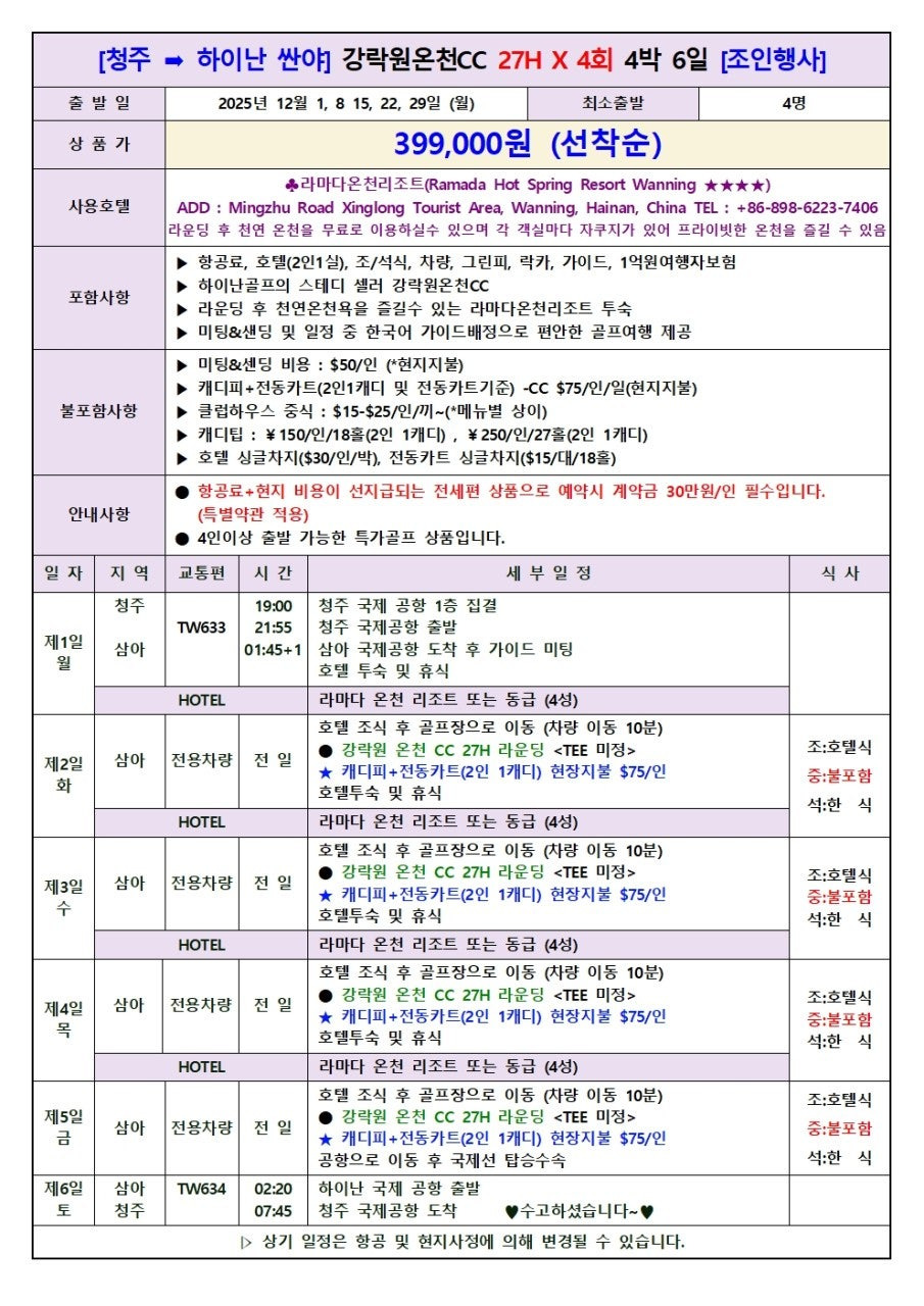 #하이난골프여행 #싼야날씨 #청주출발해외골프 #강락원온천CC #라마다리조트 #해피투어 #이지숙실장 #399특가 #겨울해외골프추천 #중국골프 #하이난온천 #가성비해외여행 #청주여행사