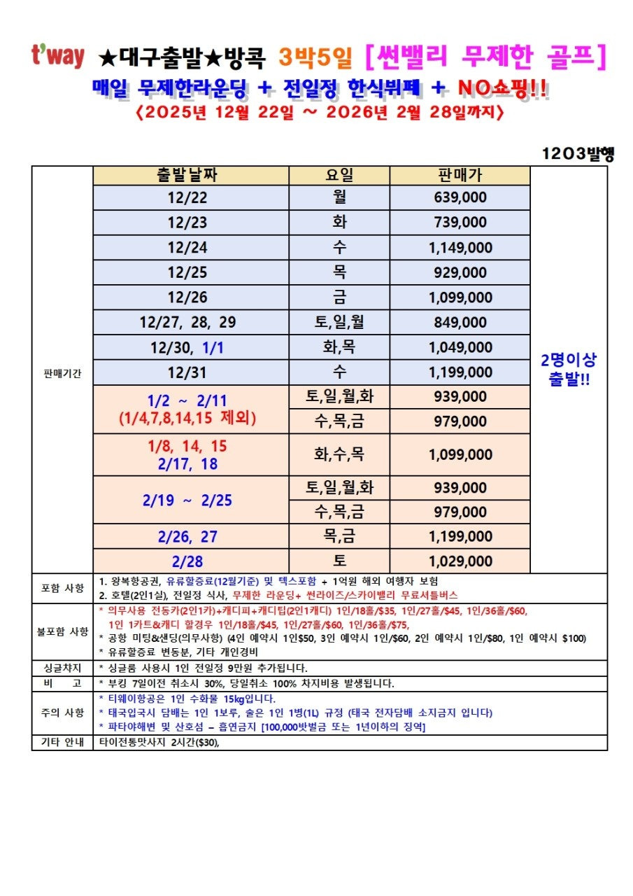 **TW 방콕 썬밸리 무제한 골프 3박5일**이