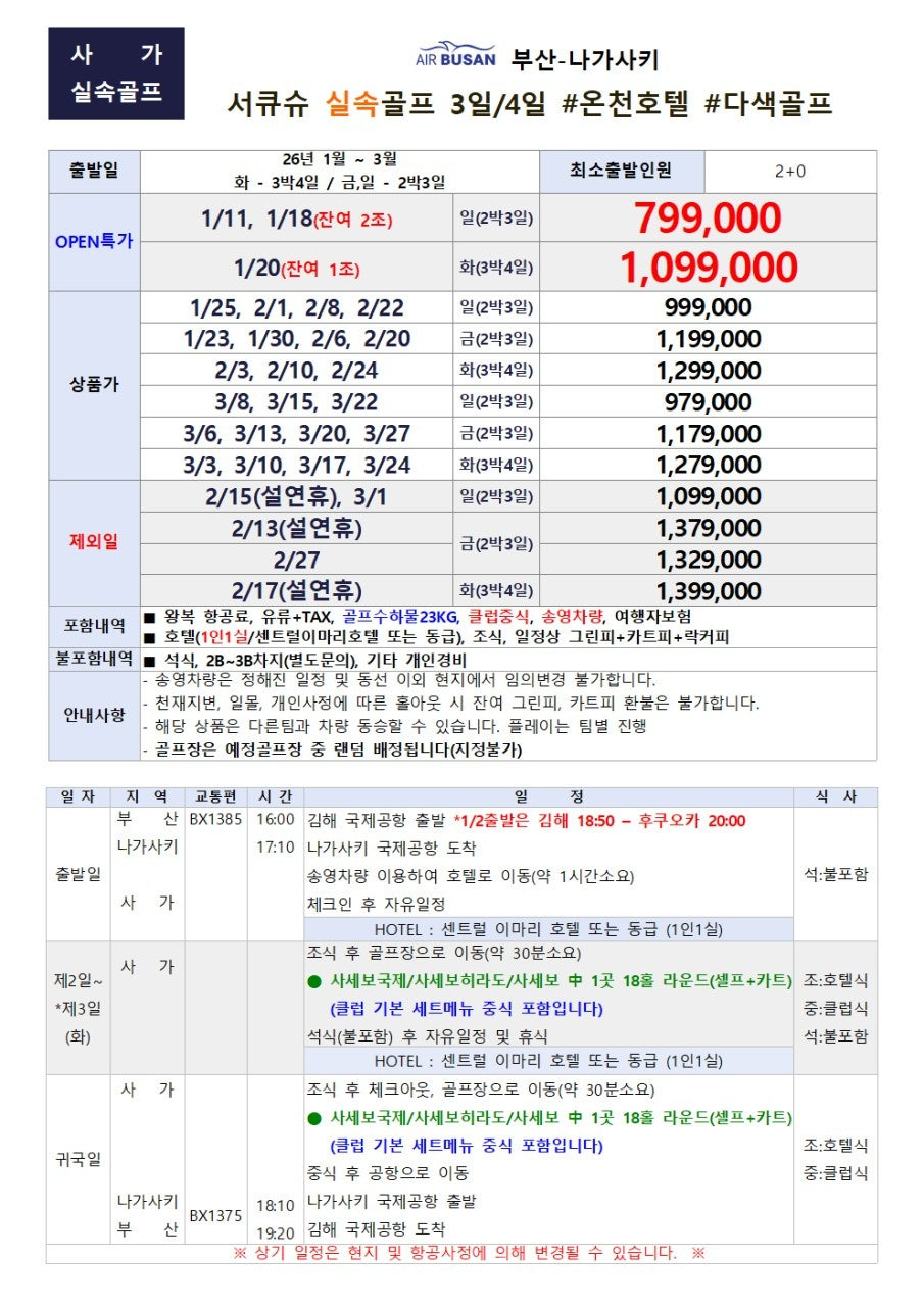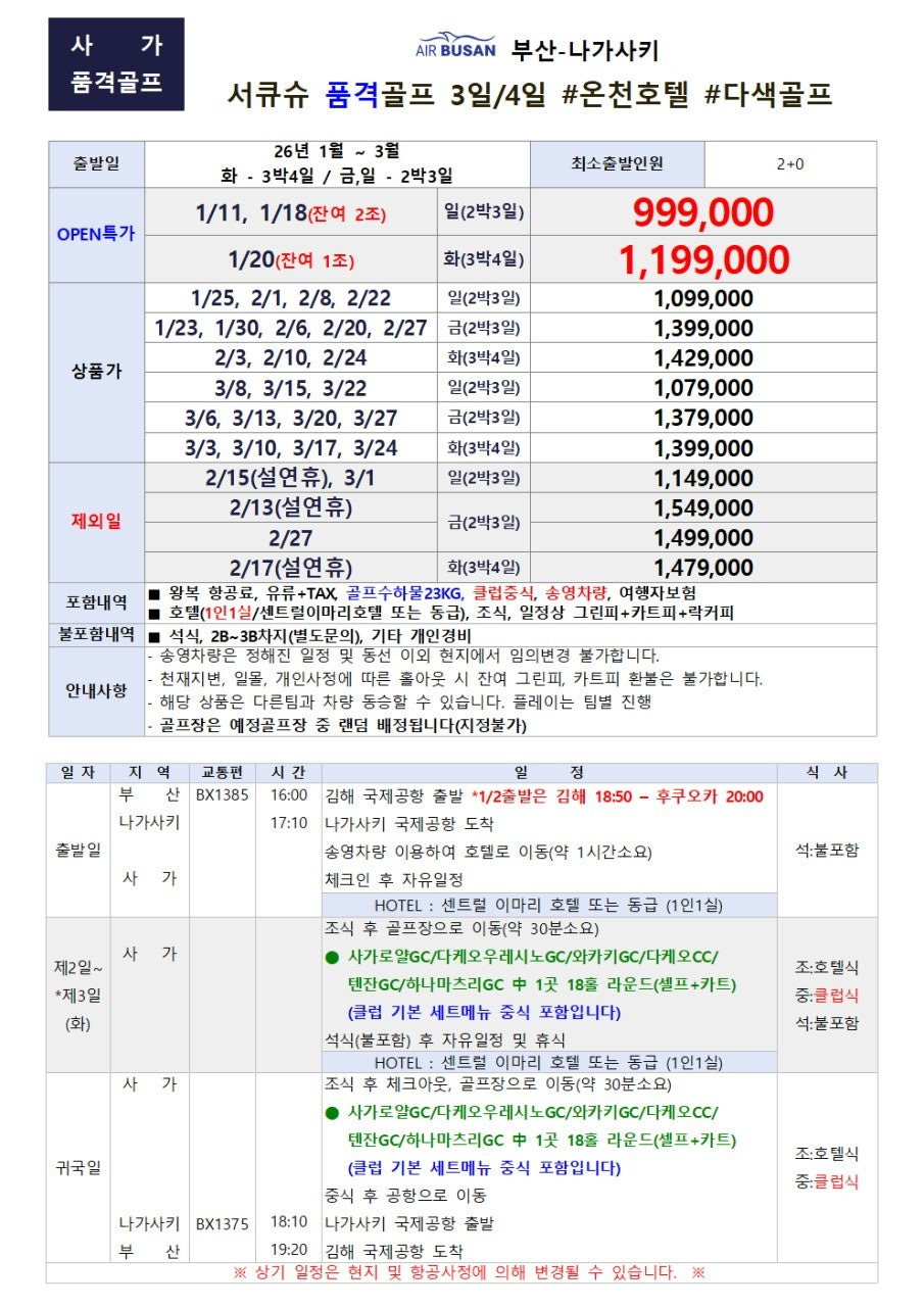* 현지 날씨: 1월~3월 나가사키 지역은 최고 기온 약 15도 내외로, 한국의 초봄 날씨와 비슷하여 겨울철에도 비교적 따뜻하게 라운딩을 즐길 수 있습니다.