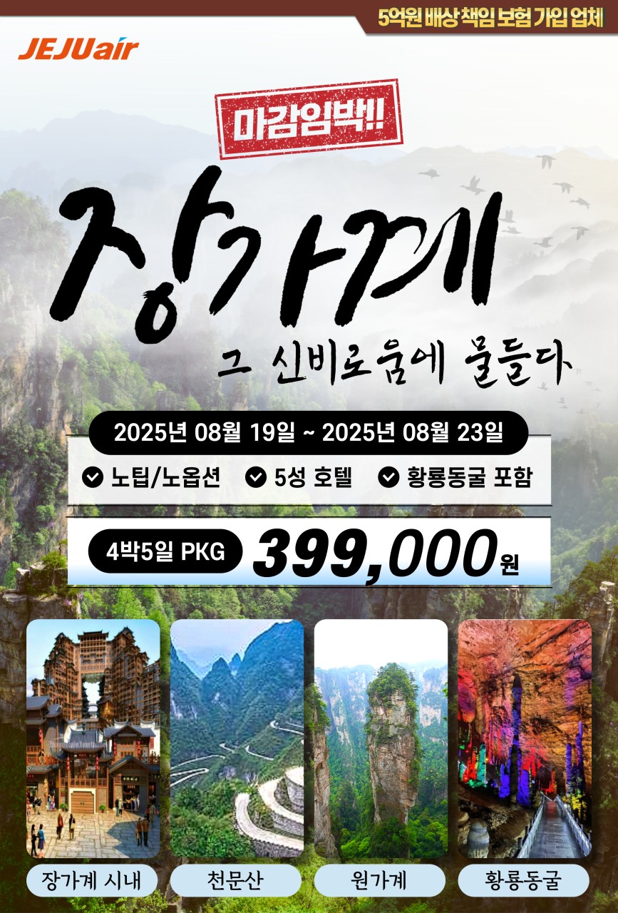 | [8월 19일 단 하루] 부산출발 장가계 초특가 – 노팁·노옵션 399,000원 (0) | 2025.08.10 |