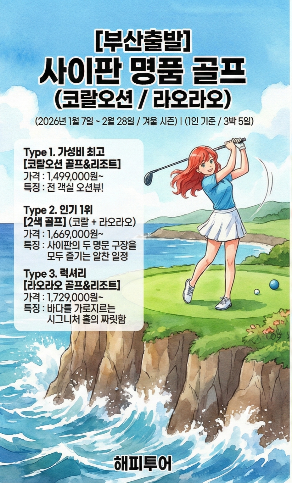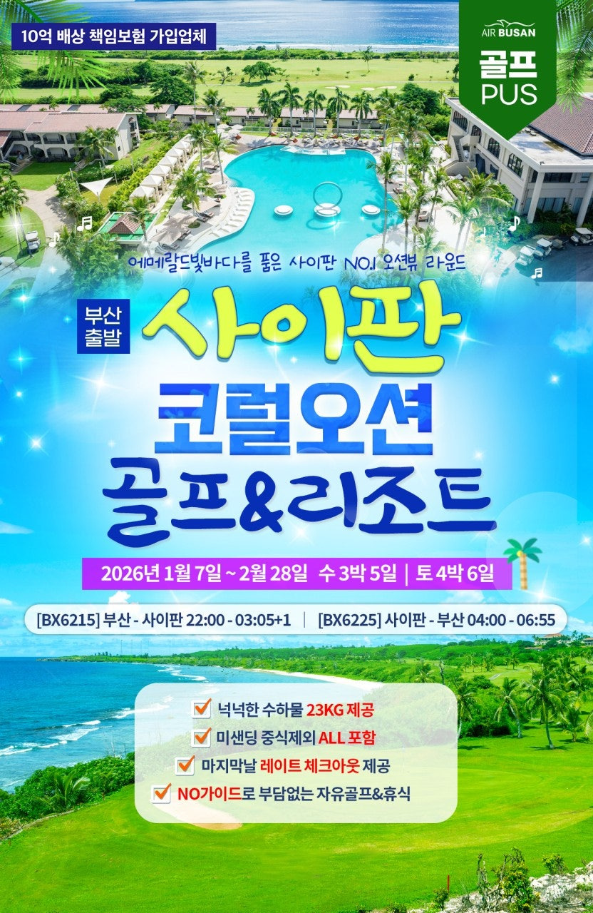 에메랄드빛 바다를 향해 티샷을 날리는 꿈, 사이판에서는 현실이 됩니다. 2026년 1월과 2월, 겨울 시즌을 맞아 부산에서 출발하는 사이판 골프 상품을 소개합니다. 이번 패키지는 밤 비행기의 피로를 덜어줄 '레이트 체크아웃'이 기본 포함되어 있어 골퍼분들의 컨디션 조절에 최적화되어 있습니다.