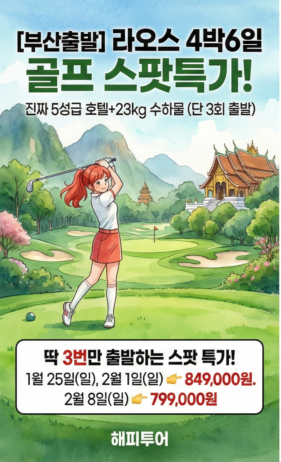 오늘은 에어부산(BX)을 이용한 라오스 비엔티엔 골프 스팟 상품을 소개합니다. 1월 말과 2월 초, 딱 3회 출발 한정으로 나왔으며, 무엇보다 호텔 퀄리티에 집중한 상품입니다. 12월 31일까지 발권 조건으로 진행되는 이번 특가의 핵심 포인트를 분석해 드립니다.