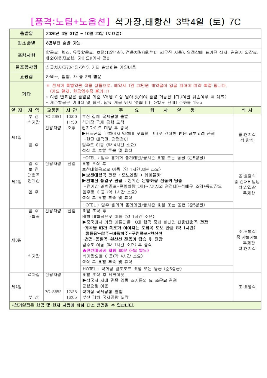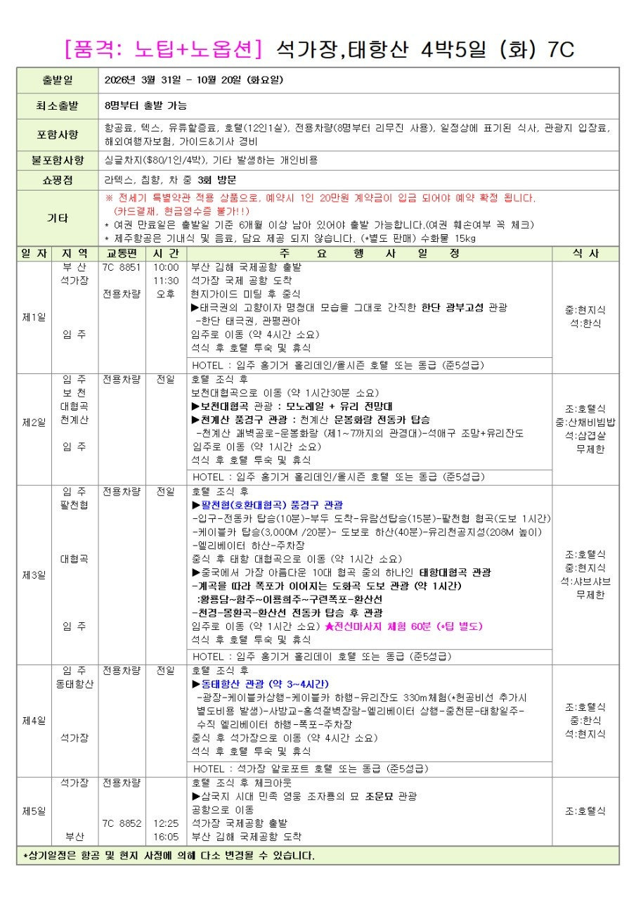 - 특징: 여유로운 일정으로 태항산의 진면목을 꼼꼼히 둘러볼 수 있습니다.