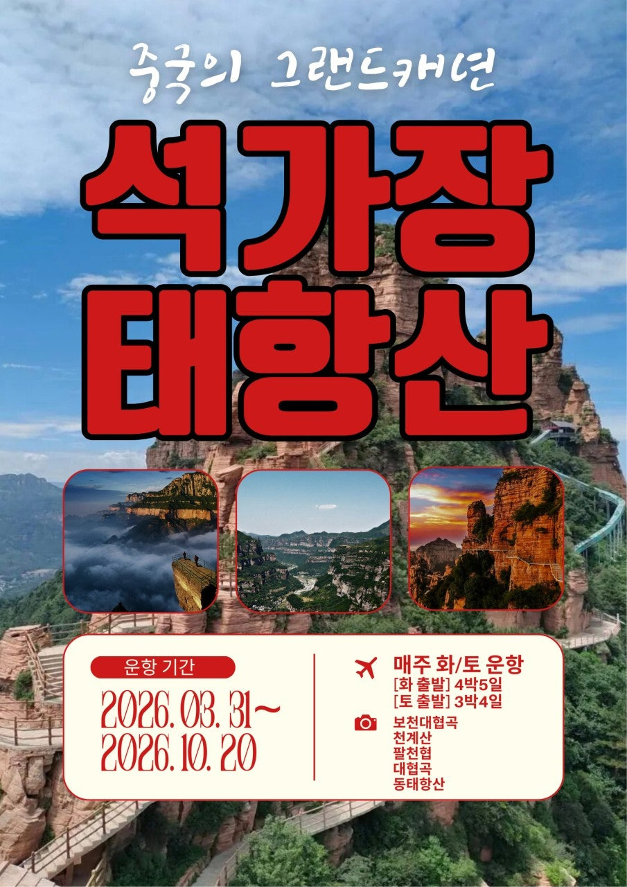 중국의 웅장한 자연을 대표하는 태항산(Taihang Mountain) 여행이 2026년 3월 31일부터 부산에서 다시 시작됩니다. 제주항공 직항을 이용하며, 현지 추가 비용 부담을 없앤 [노팁/노옵션] 고품격 상품으로 준비했습니다. 부모님 효도 여행이나 동창회 여행지로 강력 추천하는 태항산의 매력을 소개합니다.